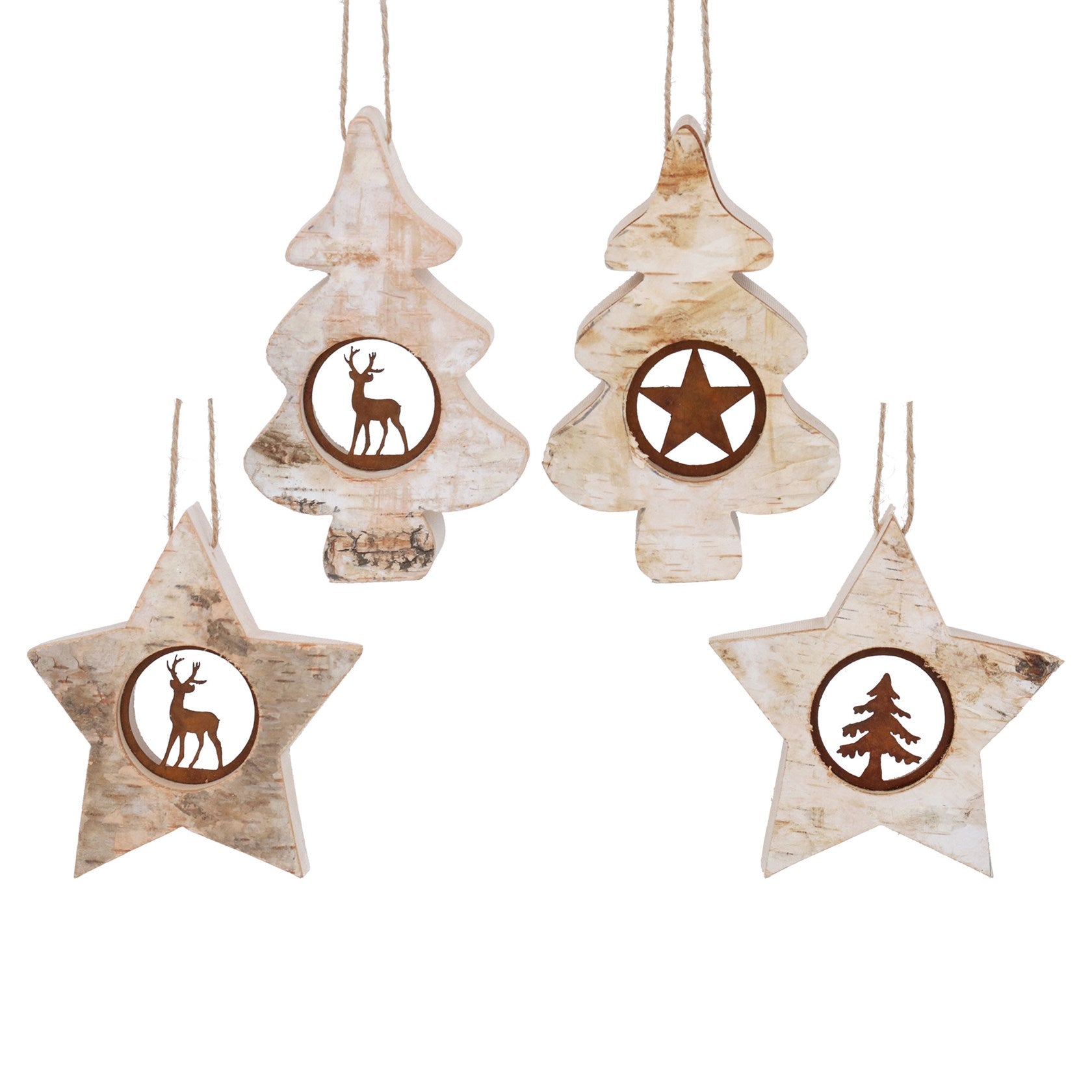 Rustic wood effect star or tree design with a metal ring. Sold individually. Dimensions: 13cm x 11cm x 2cm