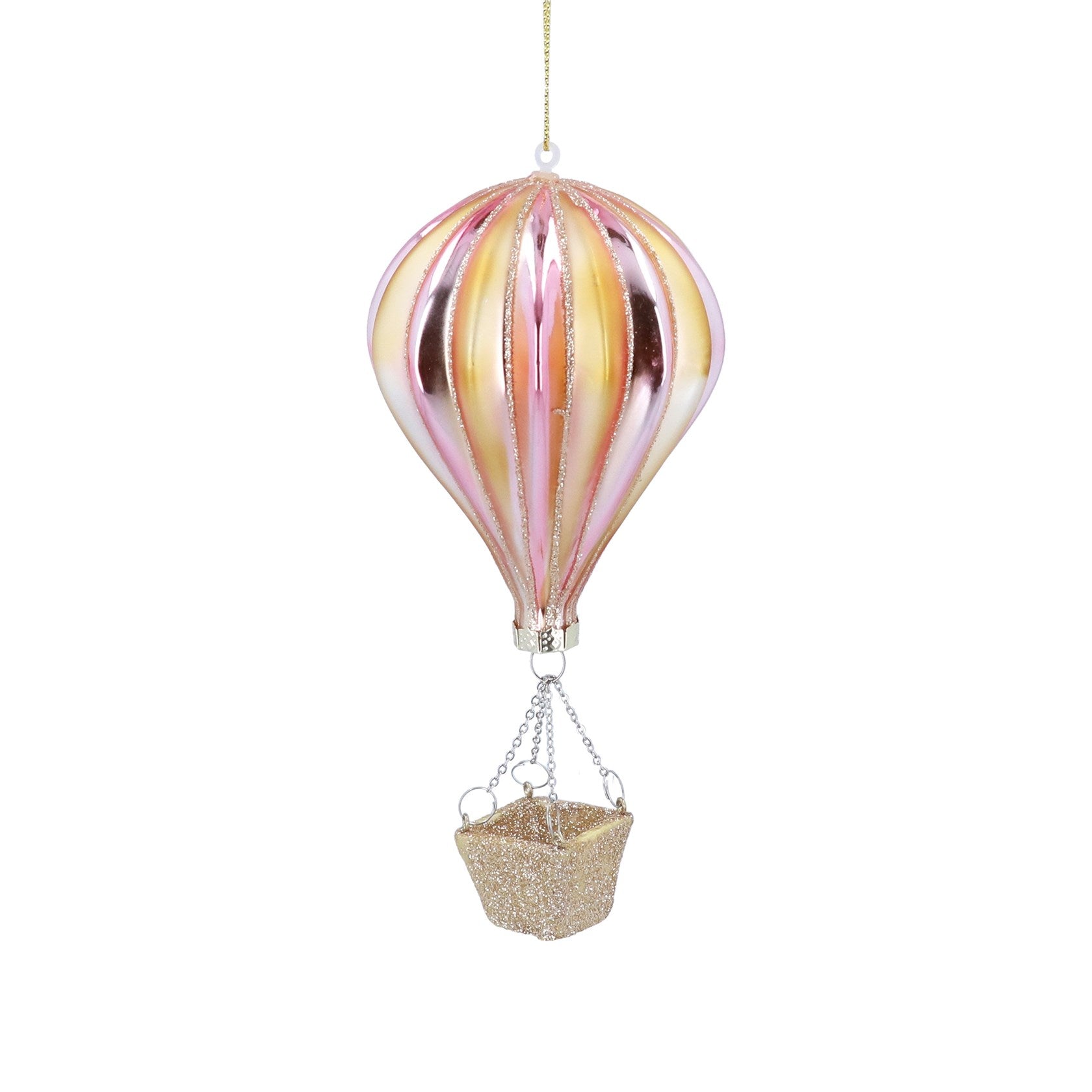 This enchanting hanging glass bauble features a whimsical hot air balloon design in soft pink and gold, complete with a glittery basket below that adds a sparkling touch.