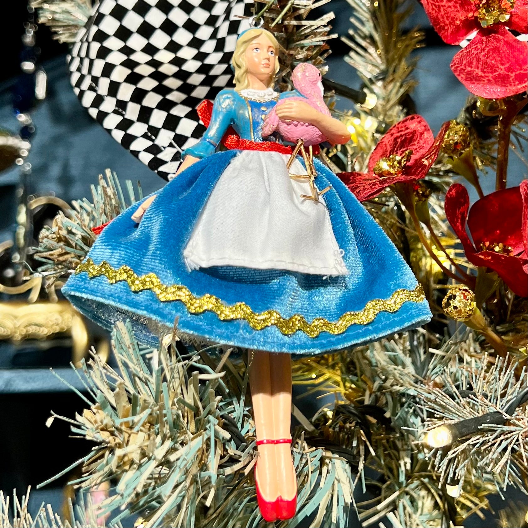 This Resin Alice Hanging Decoration, holding her flamingo and dressed in a soft velvet fabric skirt, captures the whimsical charm of Alice in Wonderland.