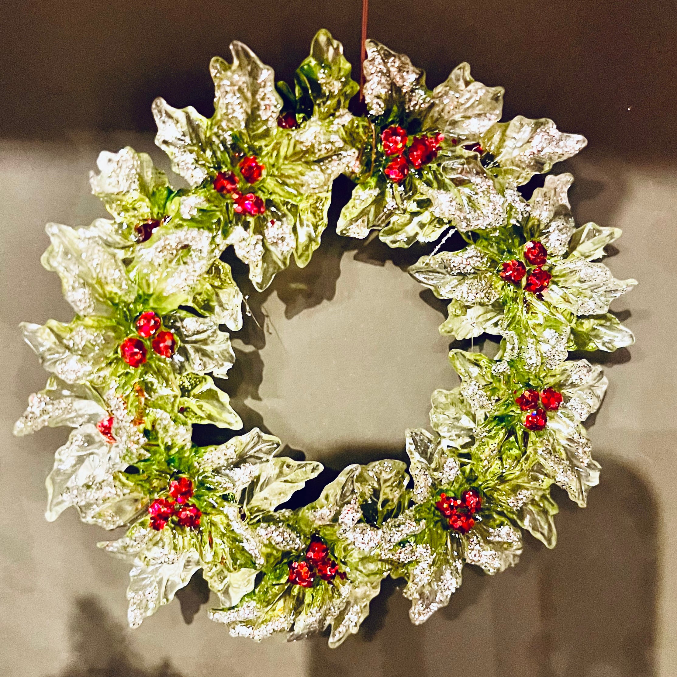Made from durable acrylic, this hanging festive wreath features vibrant green holly leaves adorned with bright red berries.