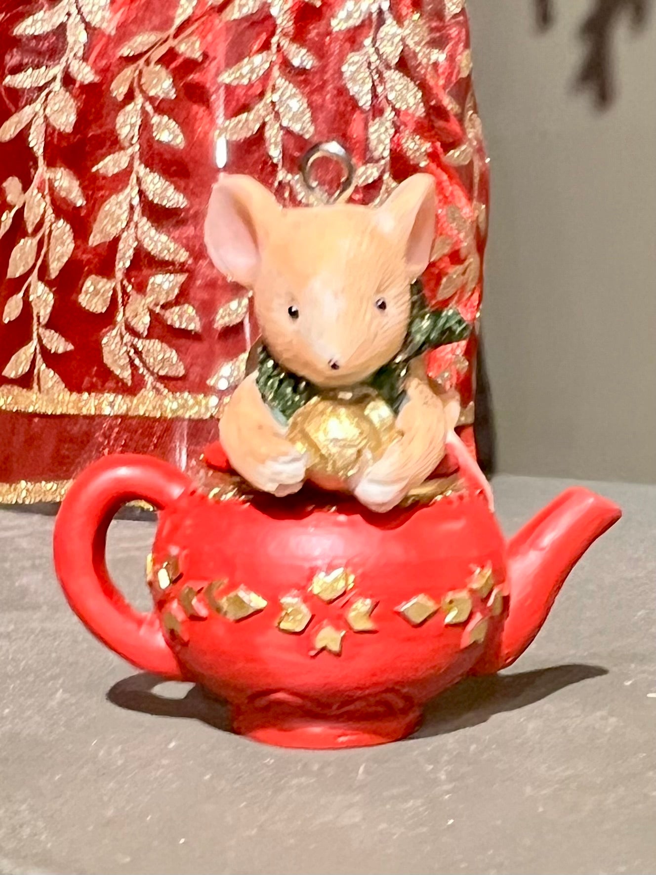 This charming resin ornament features a delightful little mouse nestled inside a classic teapot.
