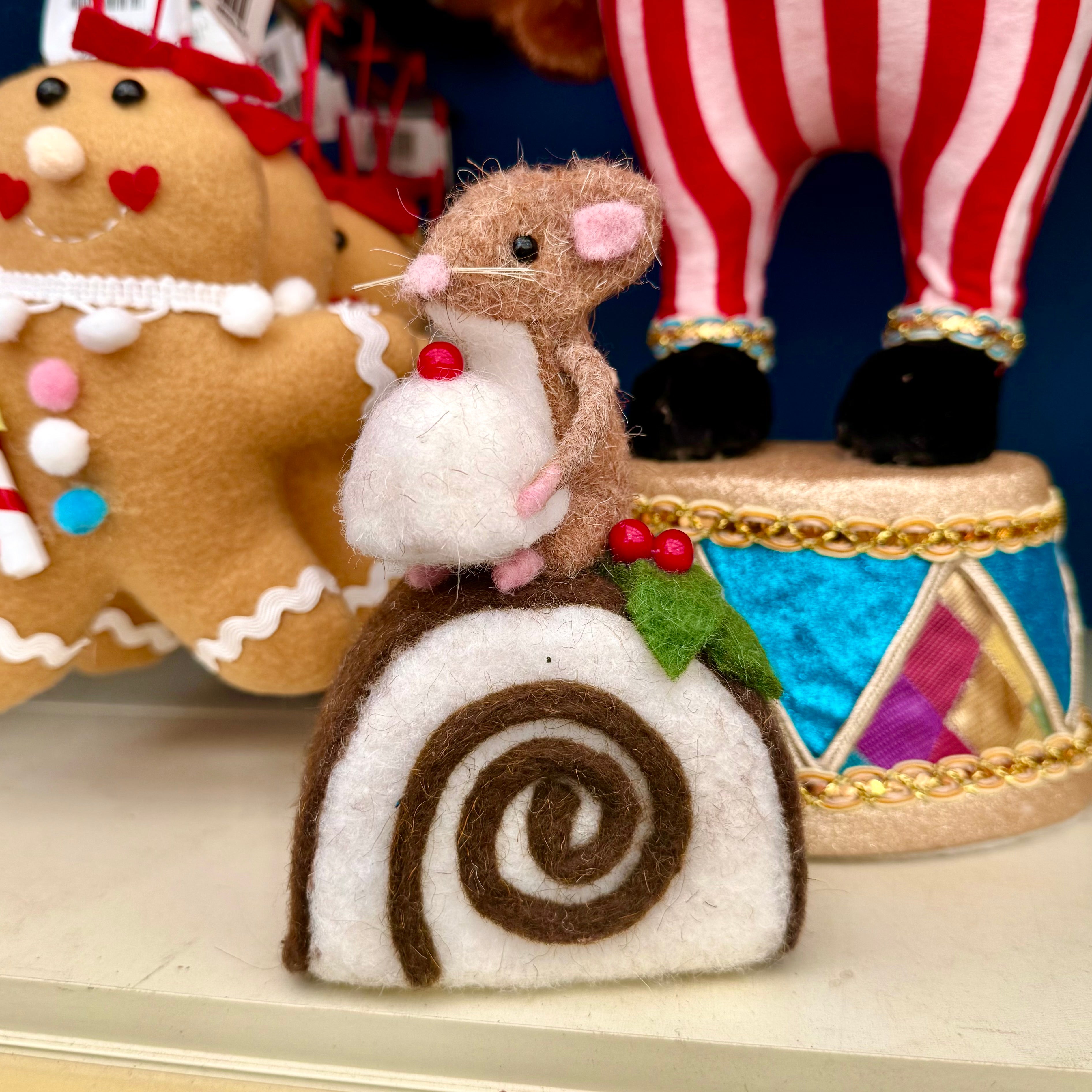 Adorable Mixed Wool Mouse on Chocolate Roll Ornament, perfect festive addition. Dimensions: 14cm x 9cm x 8cm