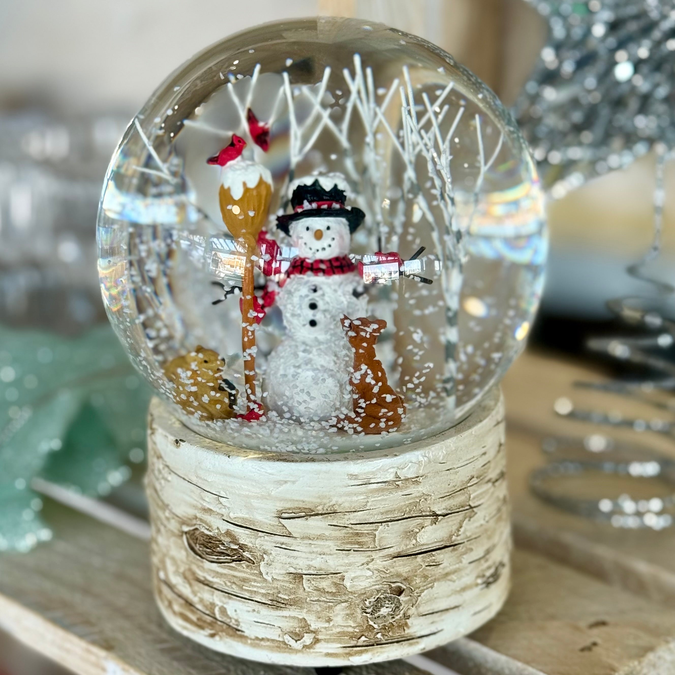 Celebrate winter’s charm with this musical snow globe featuring a cheerful snowman in a snowy forest, accompanied by a fox and squirrel at its base.