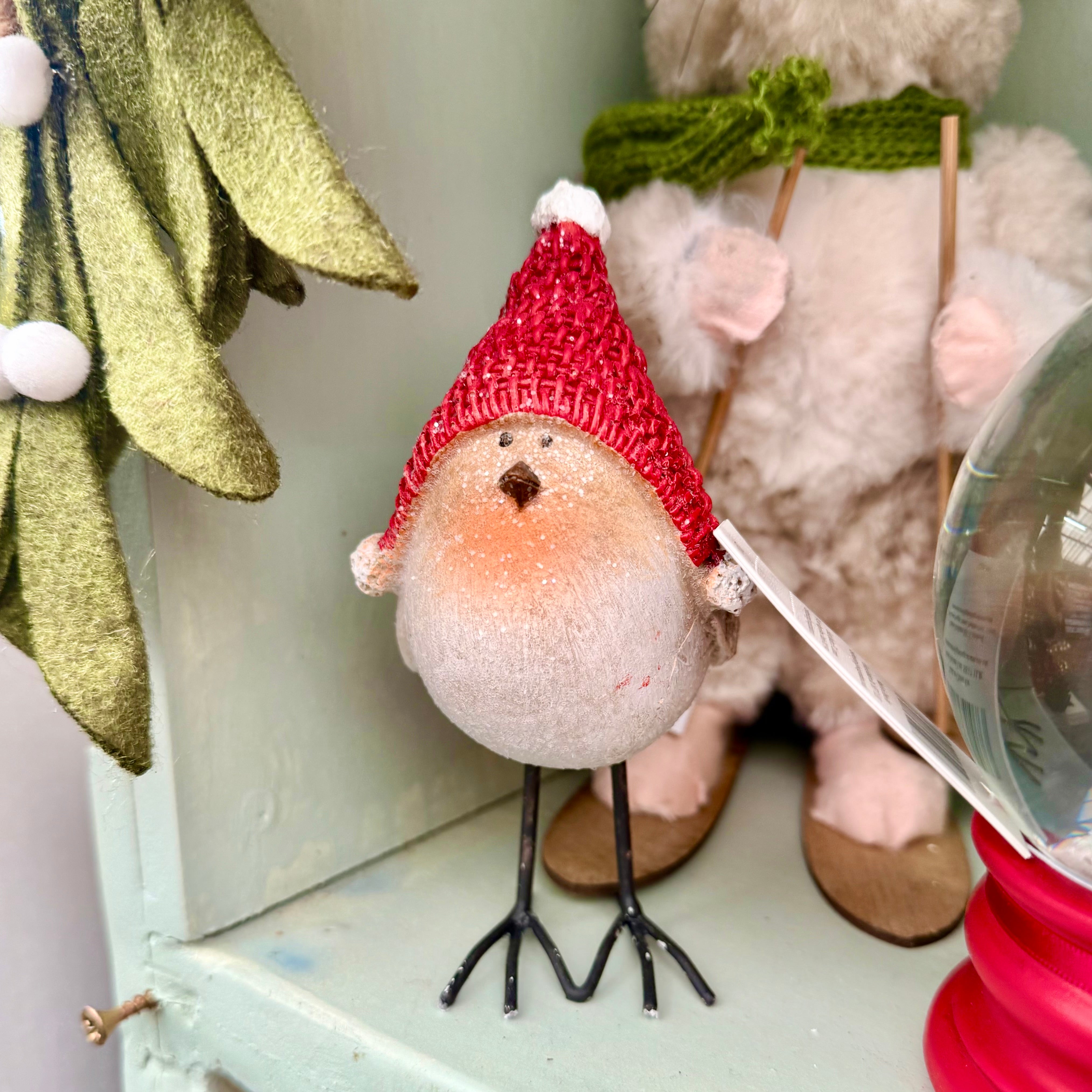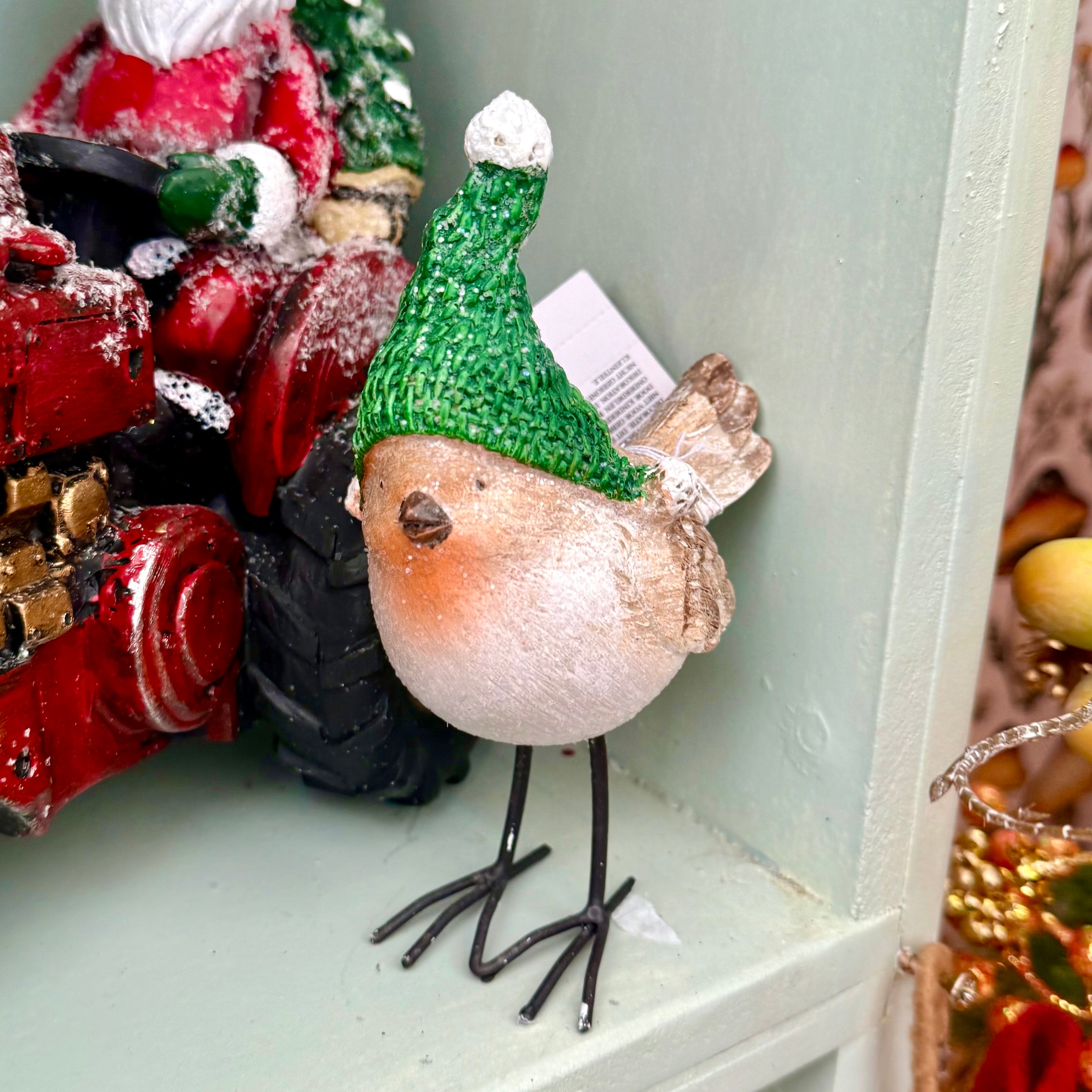 Charming robin ornament in a festive red or green hat. Sold individually. Dimensions: 15cm x 9cm x 7cm
