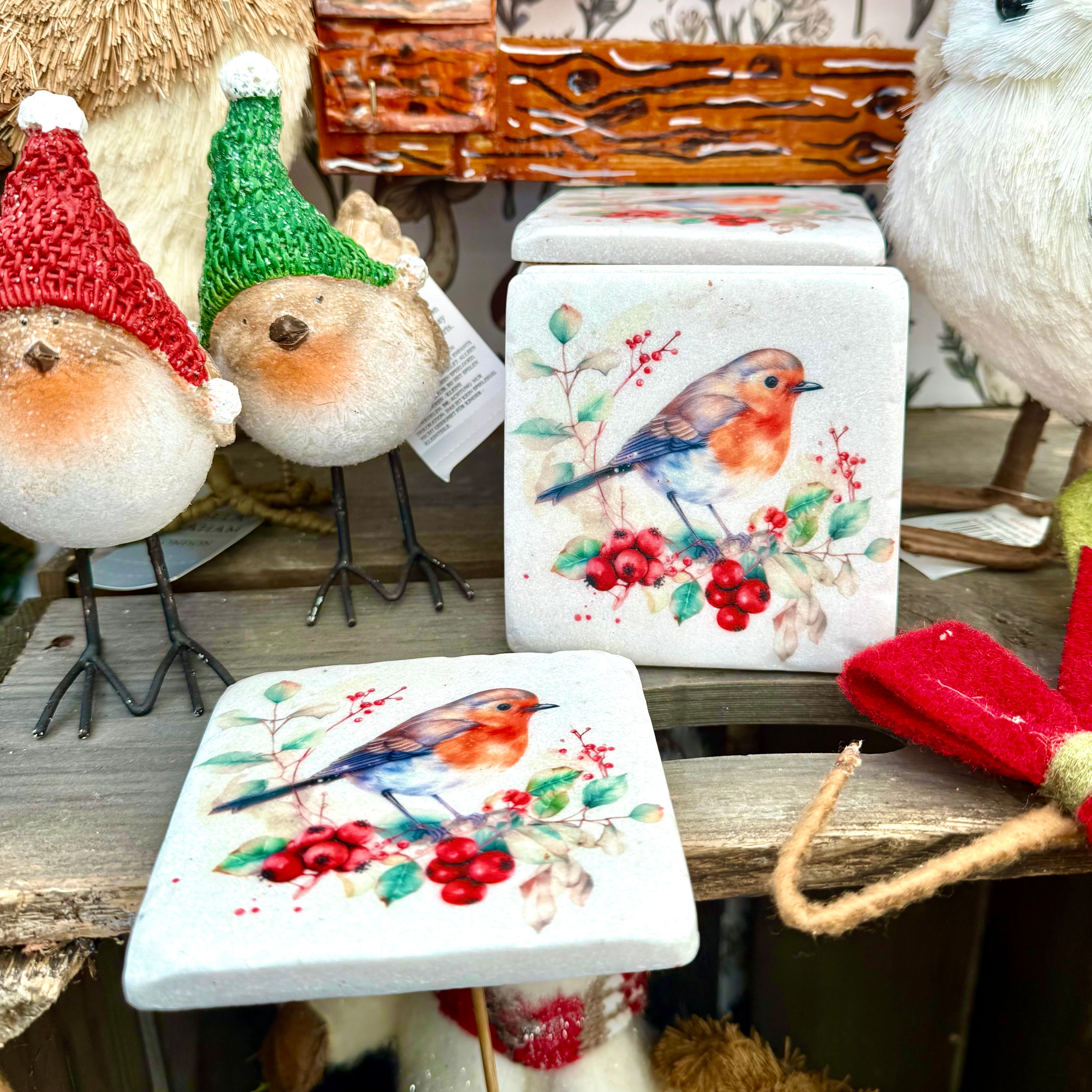 Featuring red-breasted robins perched on branches adorned with berries, these beautifully detailed resin coasters capture the essence of woodland wildlife.