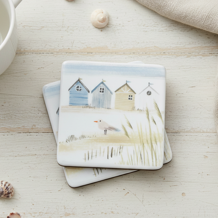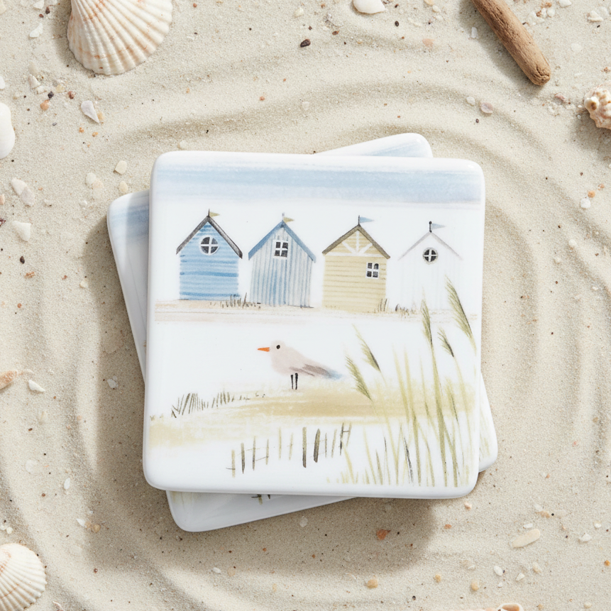 This delightfully illustrated bone china coaster displays a beautiful beachfront scene featuring beach huts which is ever so enchanting.