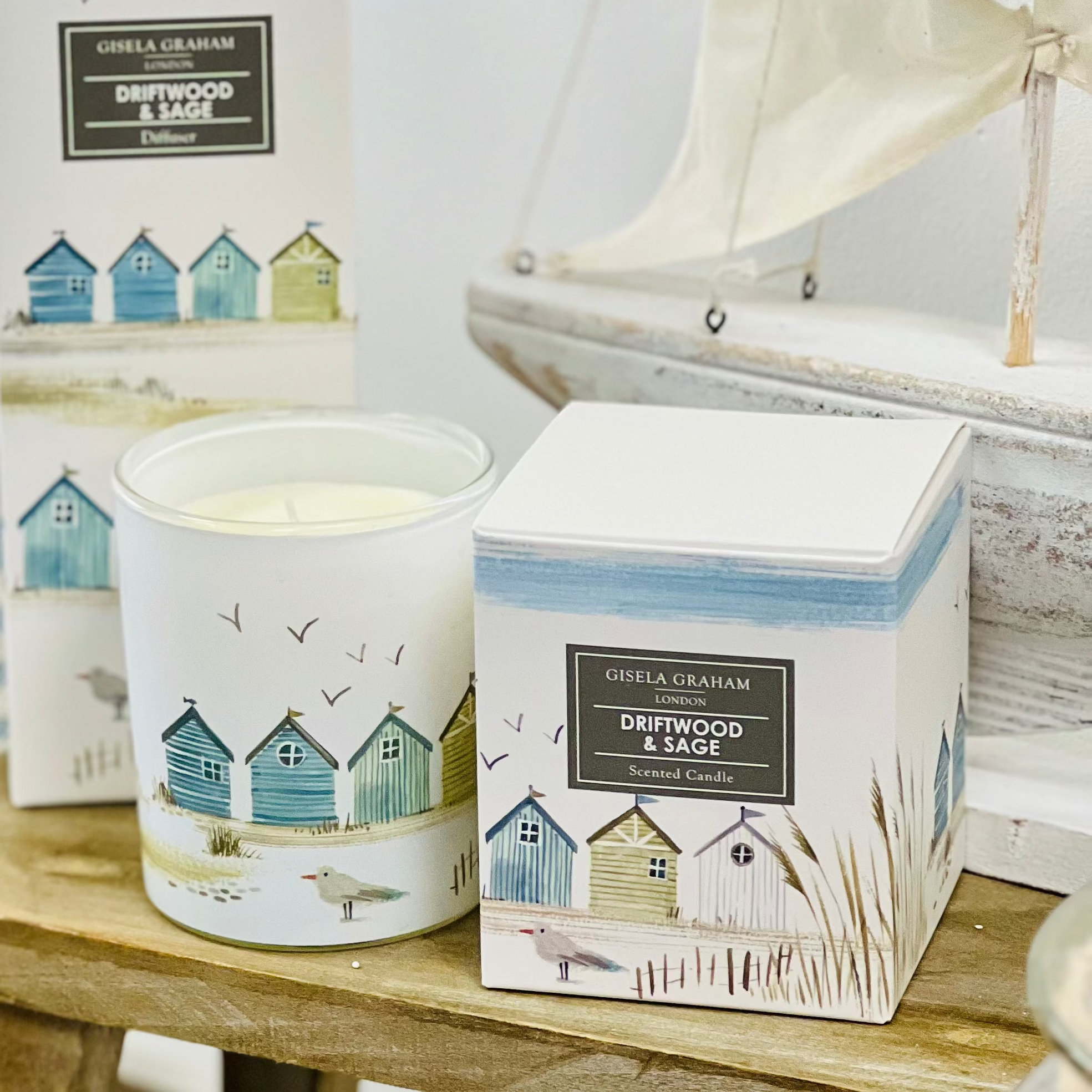 Not only is this candle gorgeously packaged, the candle itself has a gorgeous illustration of a beachfront featuring beach huts on the glass jar.