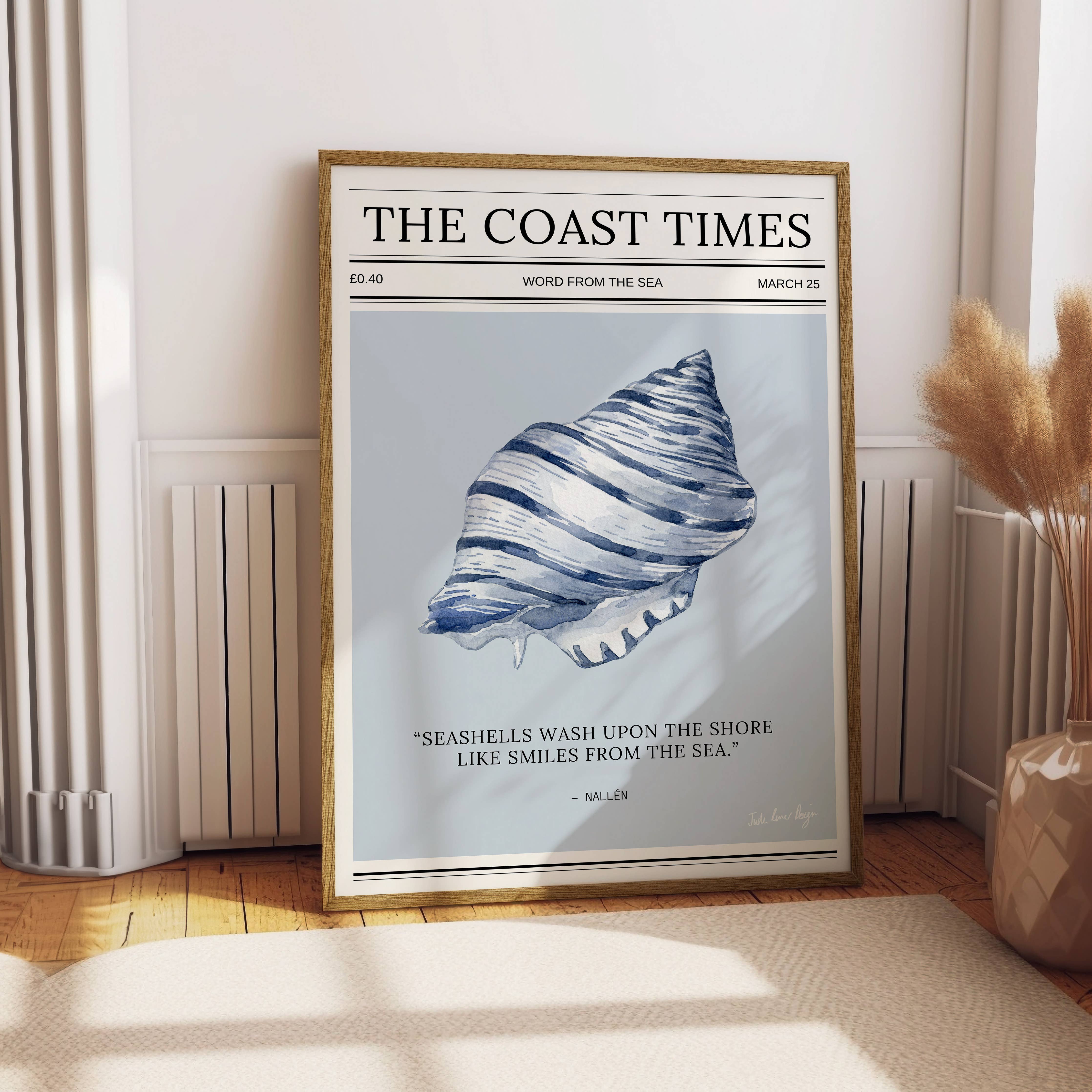 This unique coastal typography print by Jude River Design draws inspiration from classic newspaper front pages.