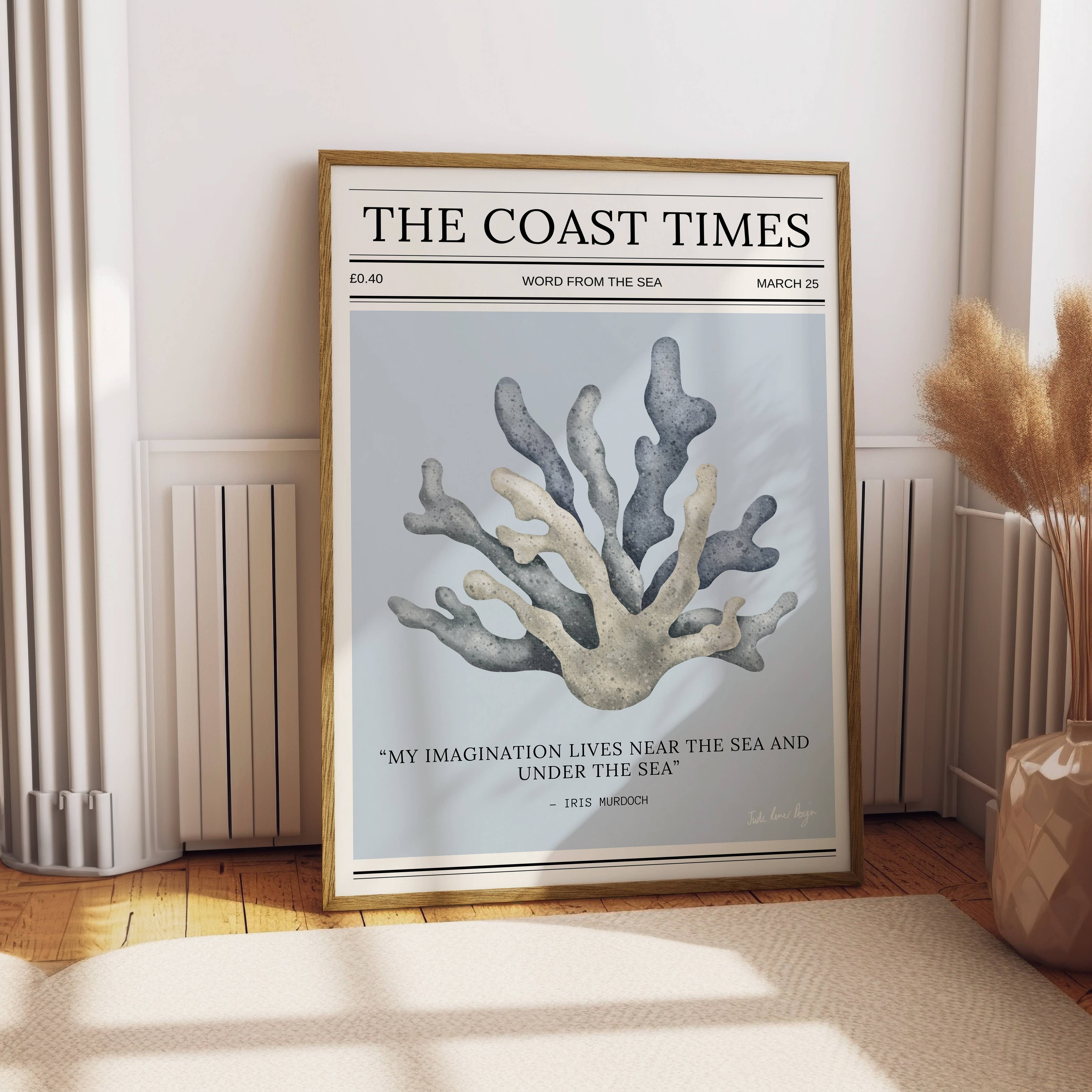 This unique coastal typography print by Jude River Design draws inspiration from classic newspaper front pages.