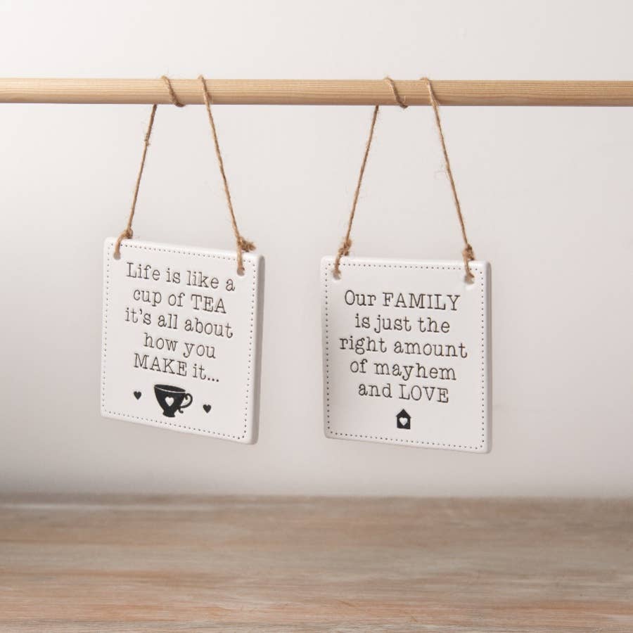 This charming ceramic sign combines an engraved slogan with a decorative pattern and a heart-adorned teacup.