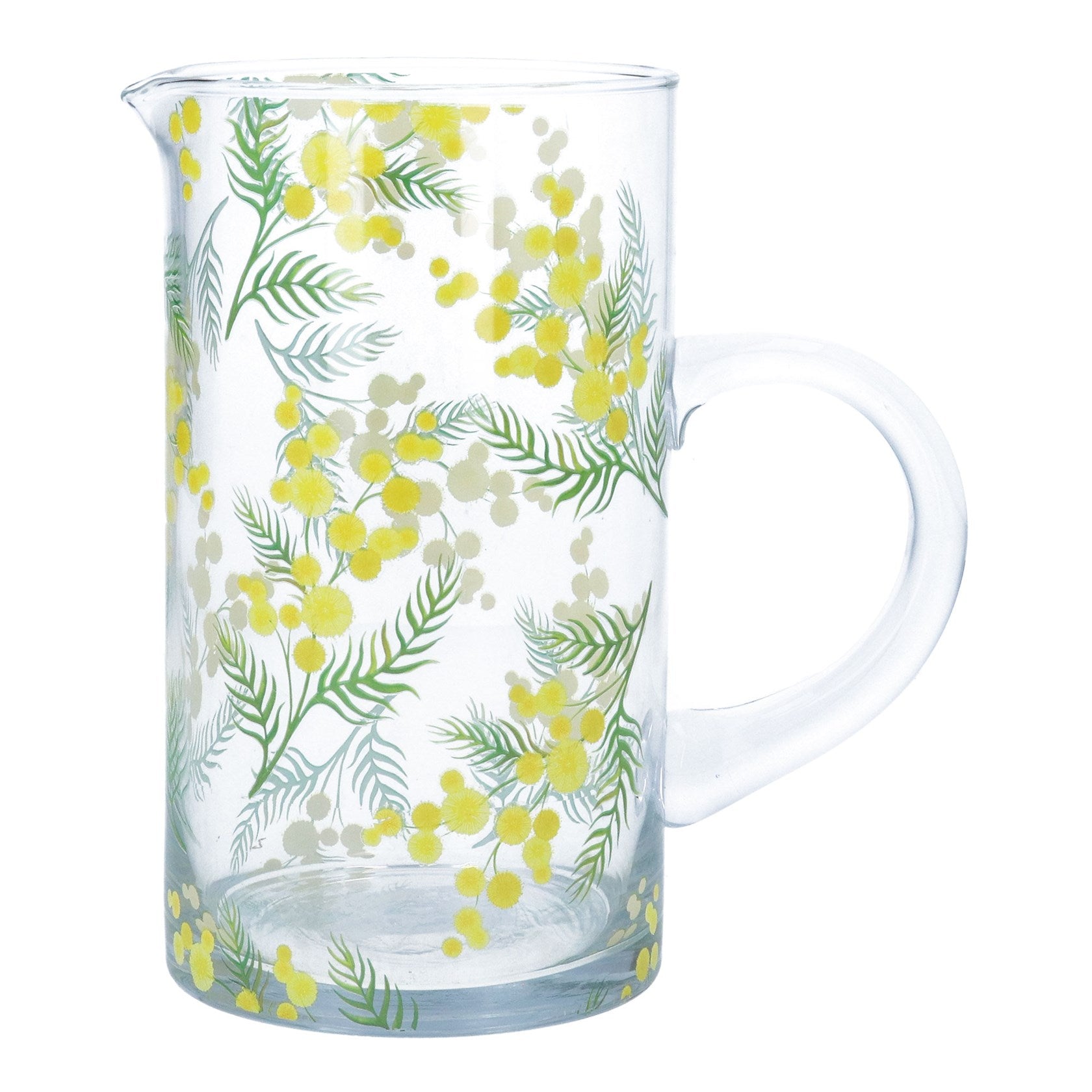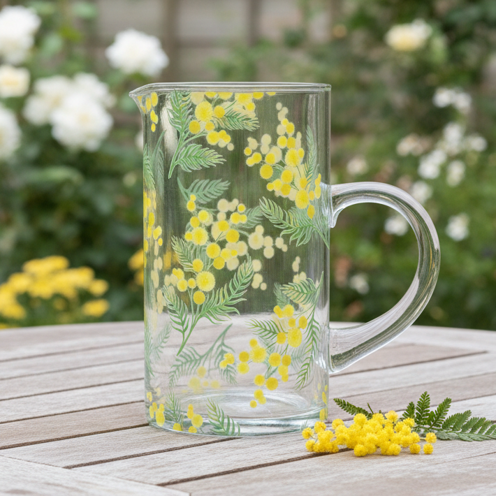Bring a touch of spring to your table with this glass water jug, featuring a delicate mimosa design.