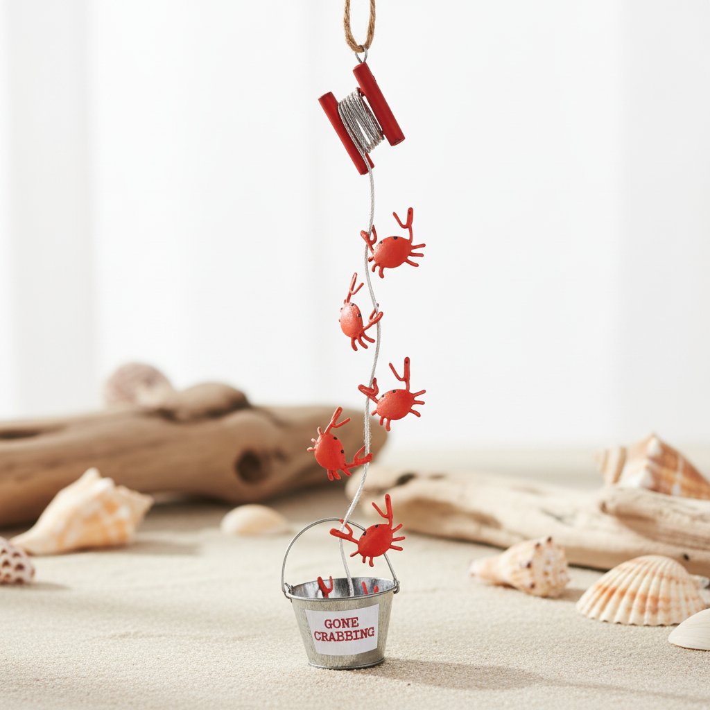 Bring a touch of seaside charm to your space with this vertical hanging ornament, featuring playful crabs along a wire and a bucket at the end with the words "Gone Crabbing."