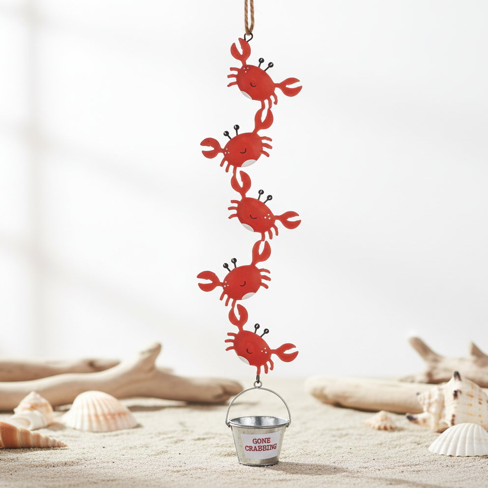 Bring a touch of seaside charm to your space with this vertical hanging ornament, featuring playful crabs along a wire and a bucket at the end with the words "Gone Crabbing."
