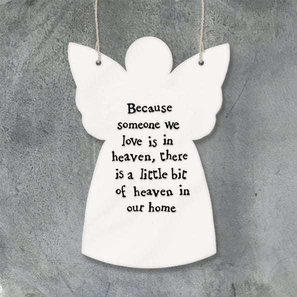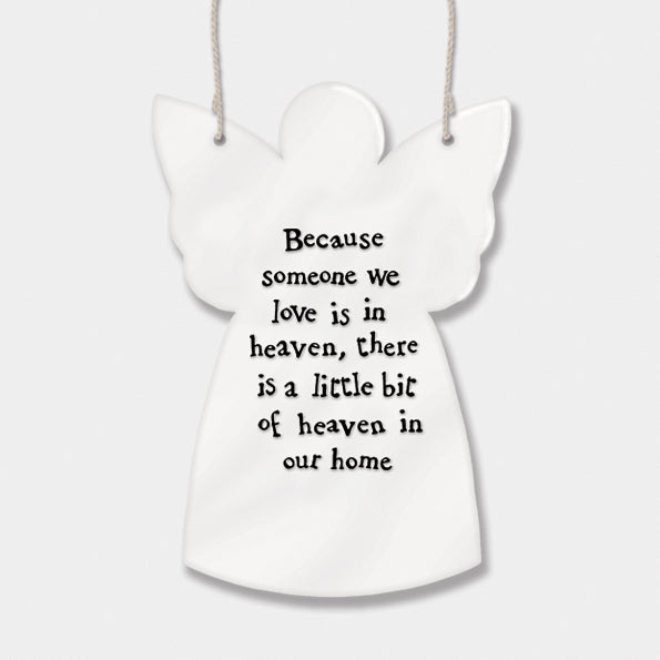 Reads “Because someone we love is in heaven, there is a little bit of heaven in our home"