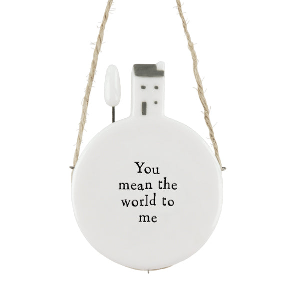 This charming mini hanging porcelain token, suspended on twine, features the heartfelt message, “You mean the world to me.”