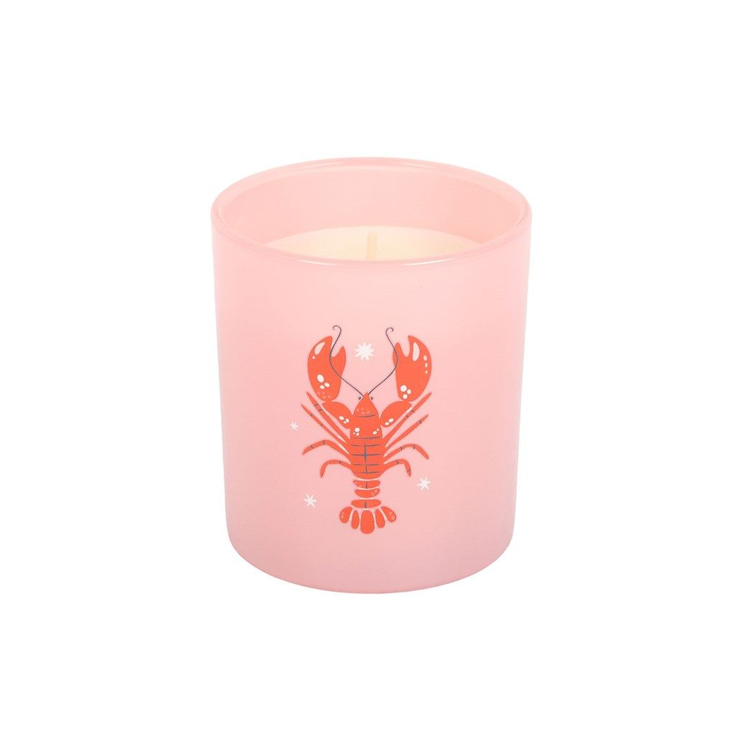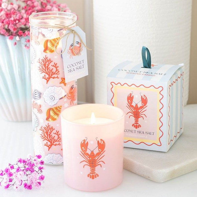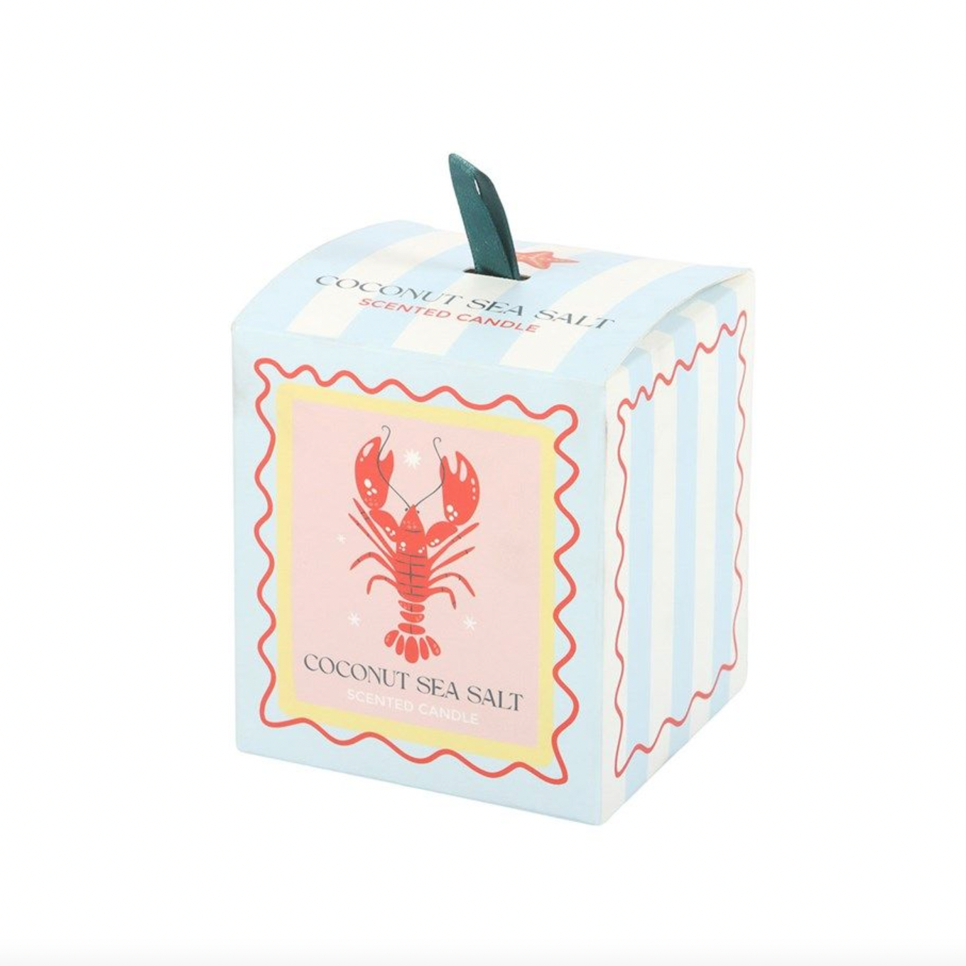 Bring beachy vibes to your space with this glass candle, featuring a playful lobster design and pastel-striped gift box.