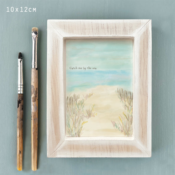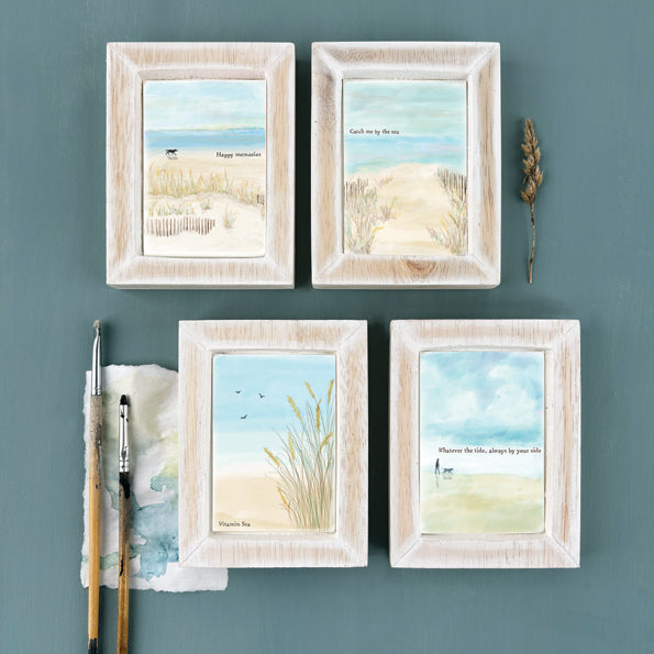 Inside, a pastel-toned painting captures the peacefulness of the beach front, evoking a sense of calm and tranquility.