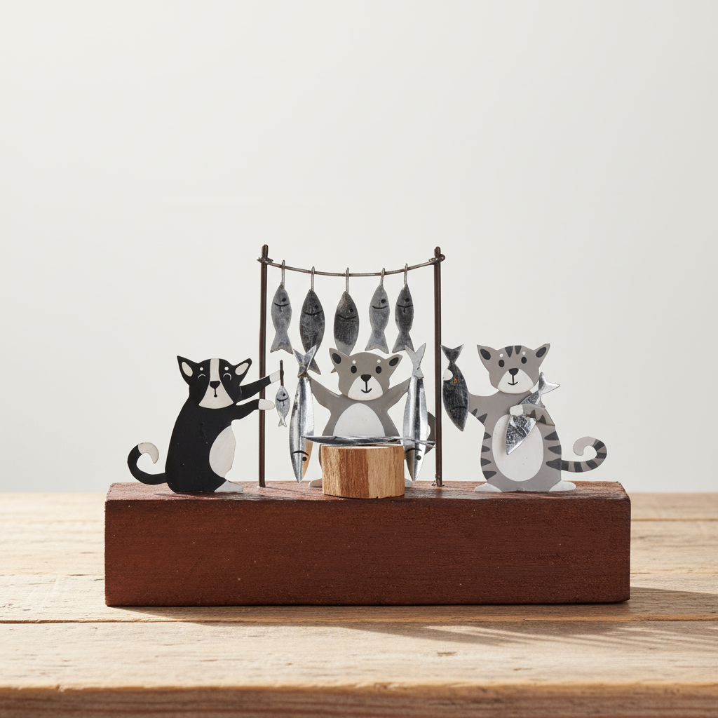 This delightful ornament features a trio of tin cats playfully perched atop a wooden block, reminiscent of a bustling fish market scene.
