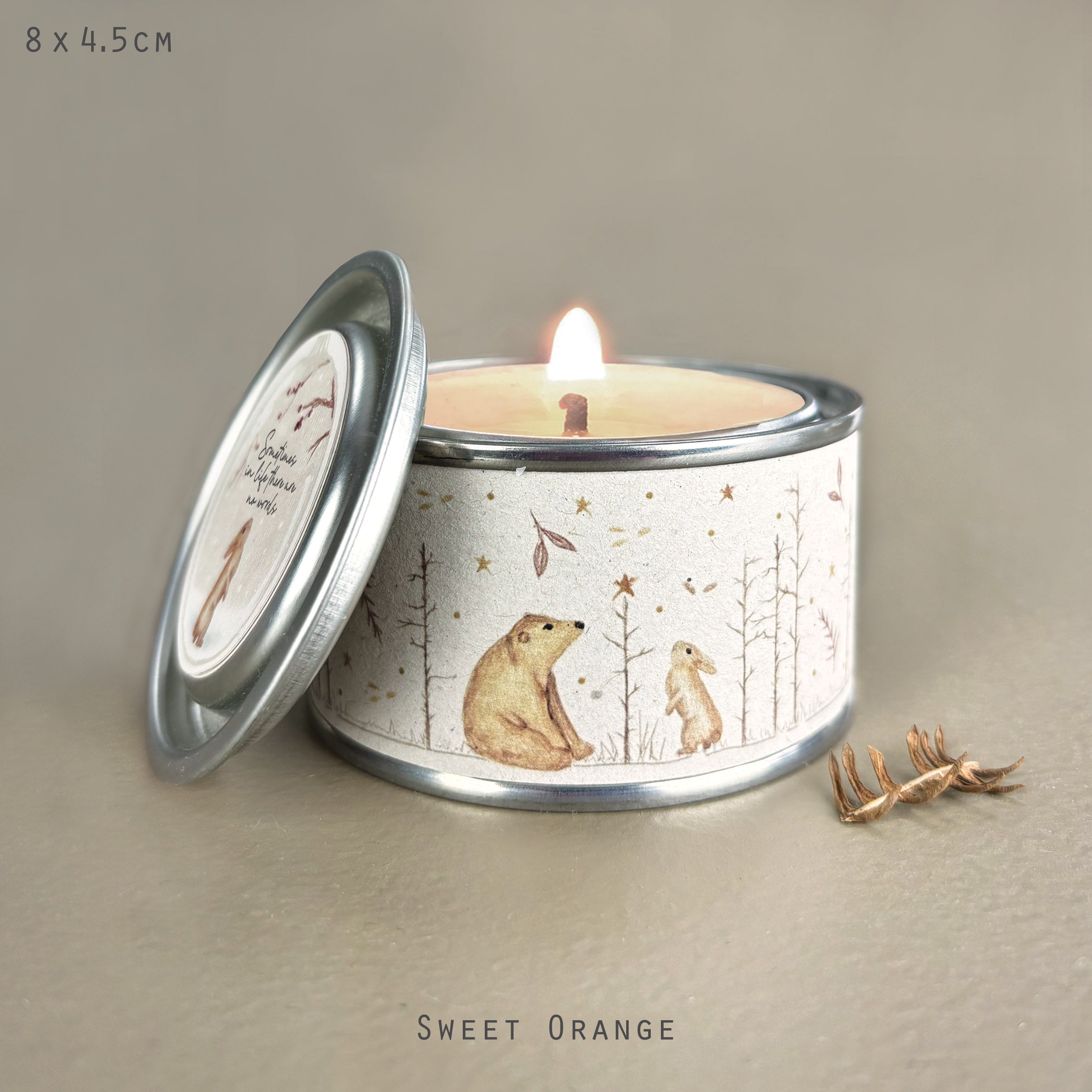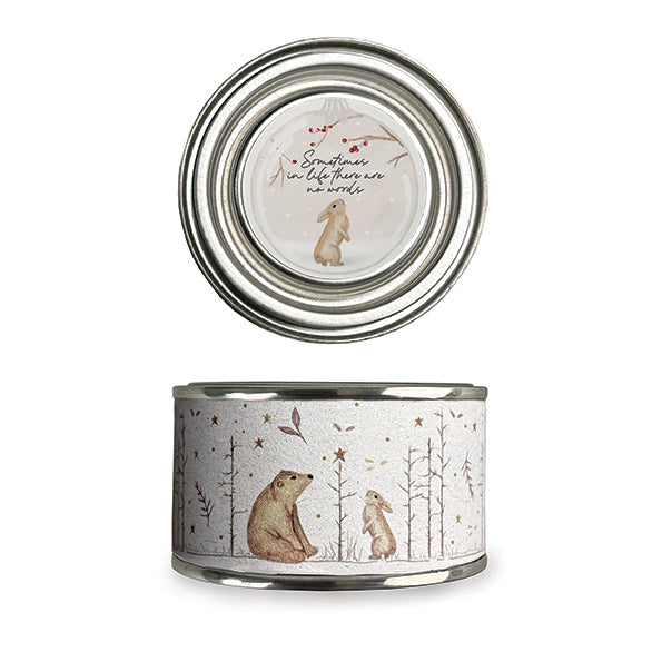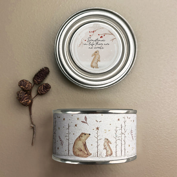 This heartwarming tin candle features a bear and bunny illustration, with the lid printed with the touching message, “Sometimes in life there are no words.”