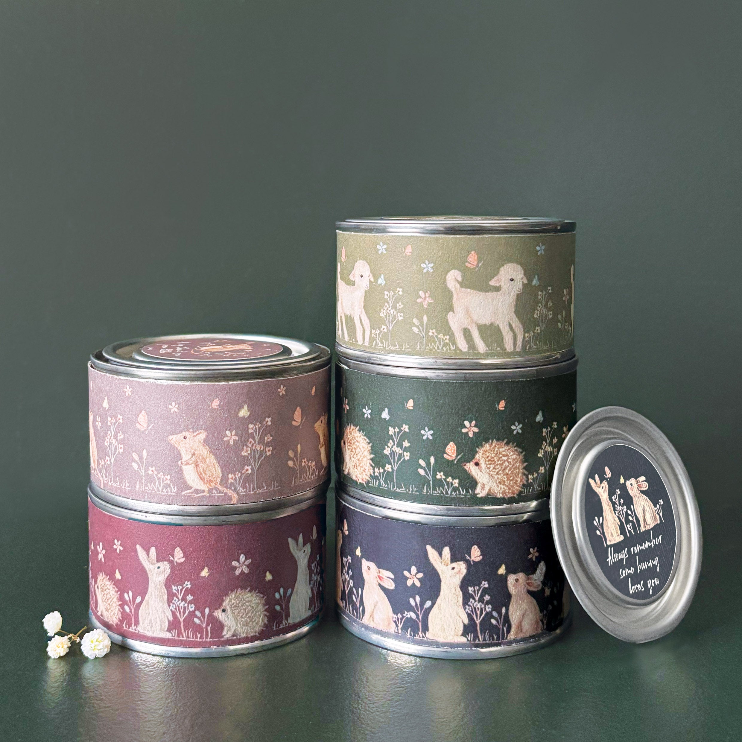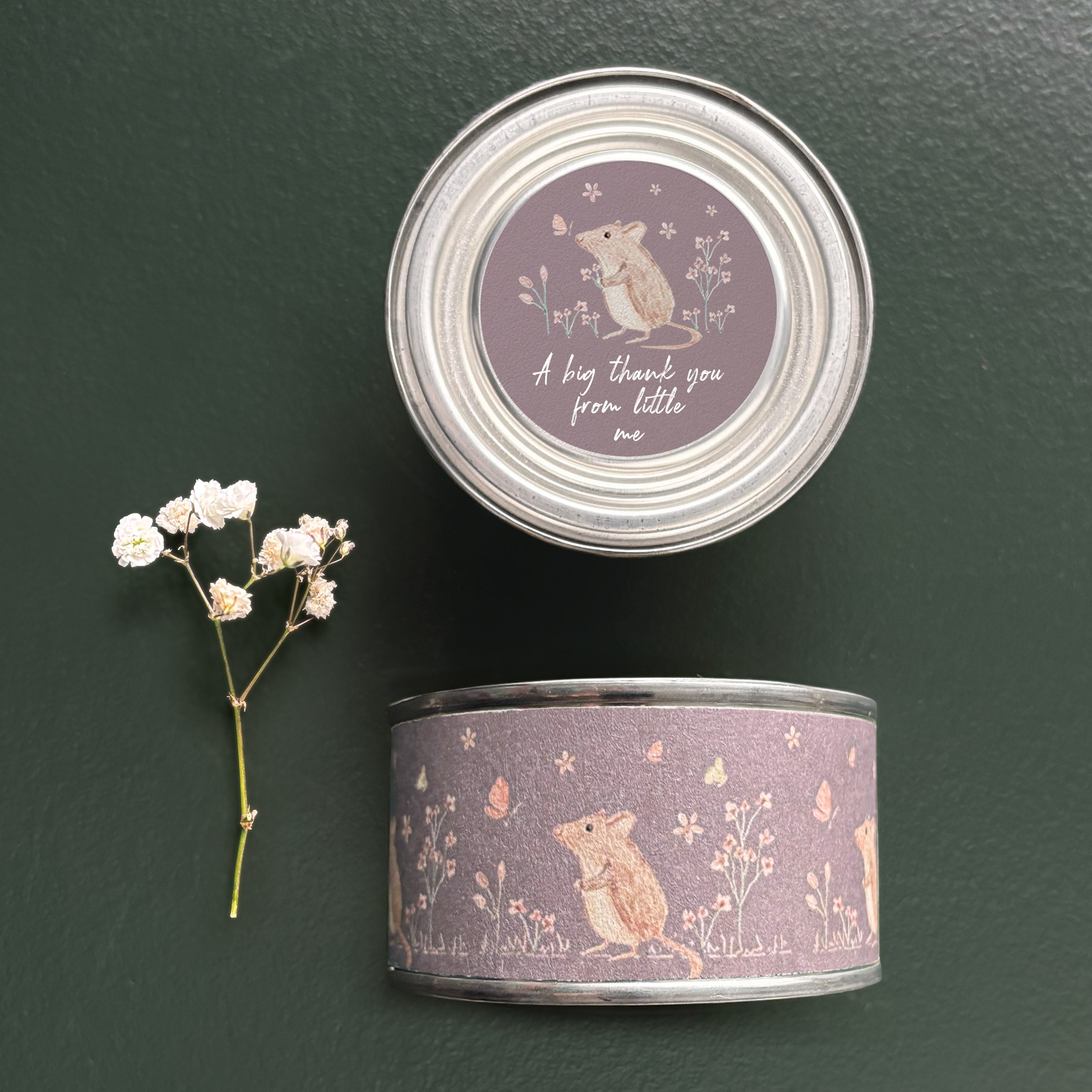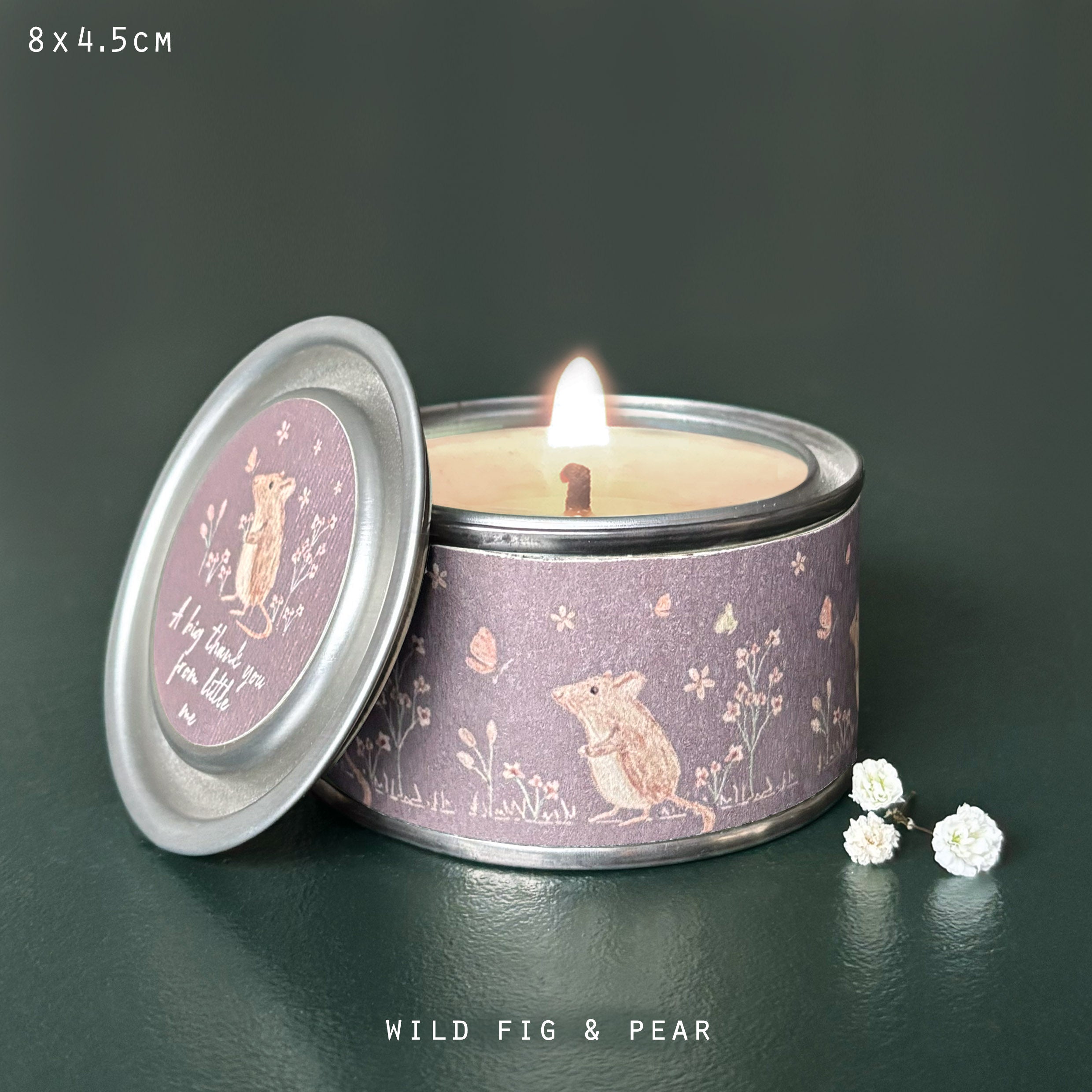 This adorable tin candle features a sweet mouse in a meadow set against a soft purple background, with the lid printed with the heartfelt message, “A big thank you from little me.”