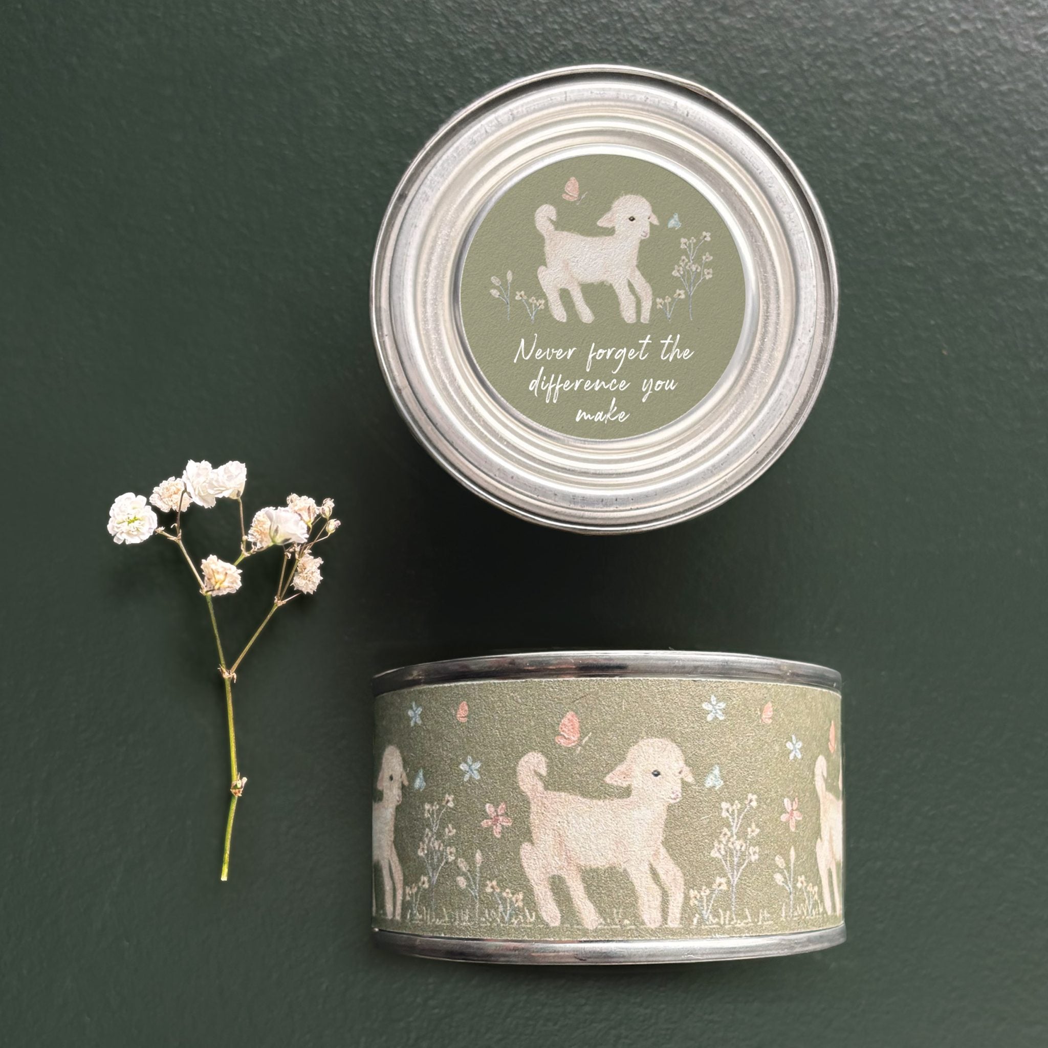 This charming tin candle features a fresh green meadow scene with a sweet spring lamb, while the lid is printed with the uplifting message “Never forget the difference you make.”