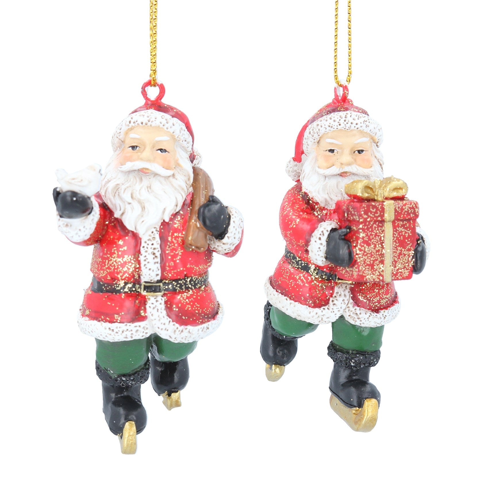 One Santa holds a bird, while the other carries a present, making them a charming and cheerful addition to your Christmas displays.