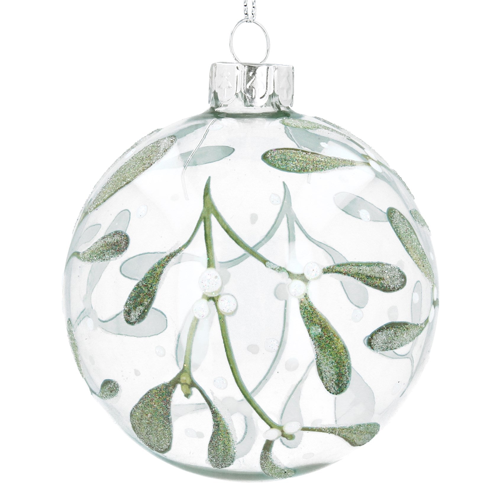 Festive Clear Glass Bauble featuring Mistletoe Sprays, cute and charming addition. Dimensions: 8cm x 8cm x 8cm