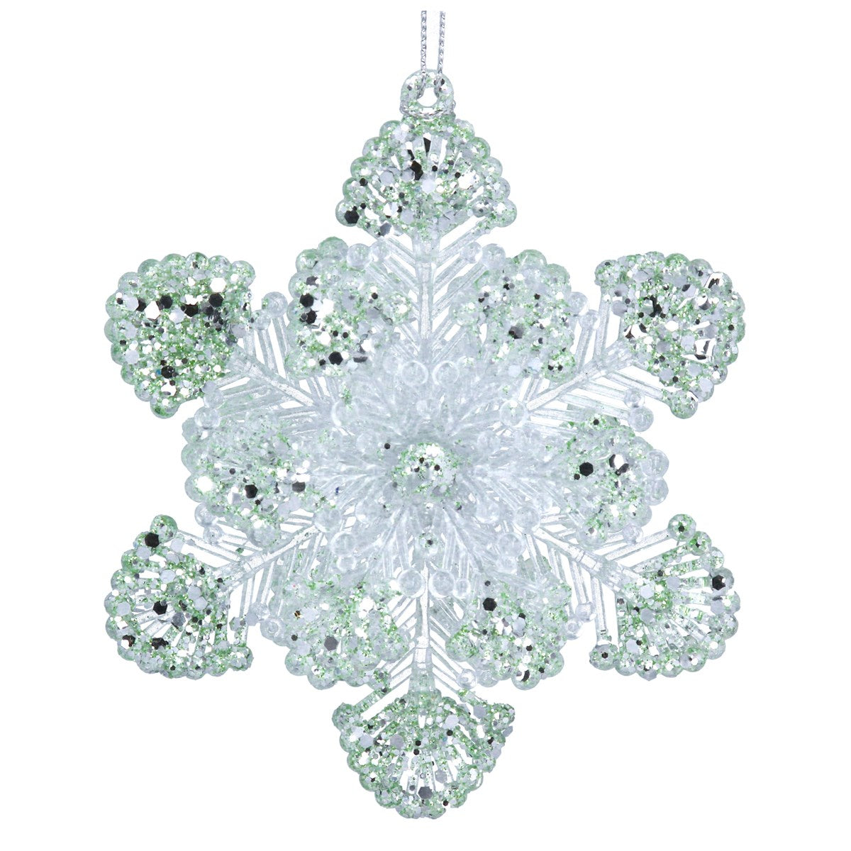 Crafted in clear acyclic with shimmering green glitter accents, this hanging snowflake will add a festive sparkle to your Christmas decor.