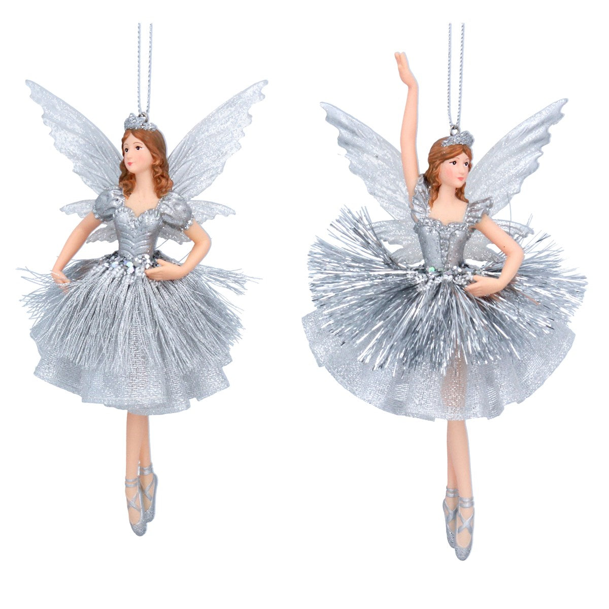 These elegant hanging resin princess fairies feature silver skirts and shimmering silver wings, adding a touch of regal charm to your holiday decor.