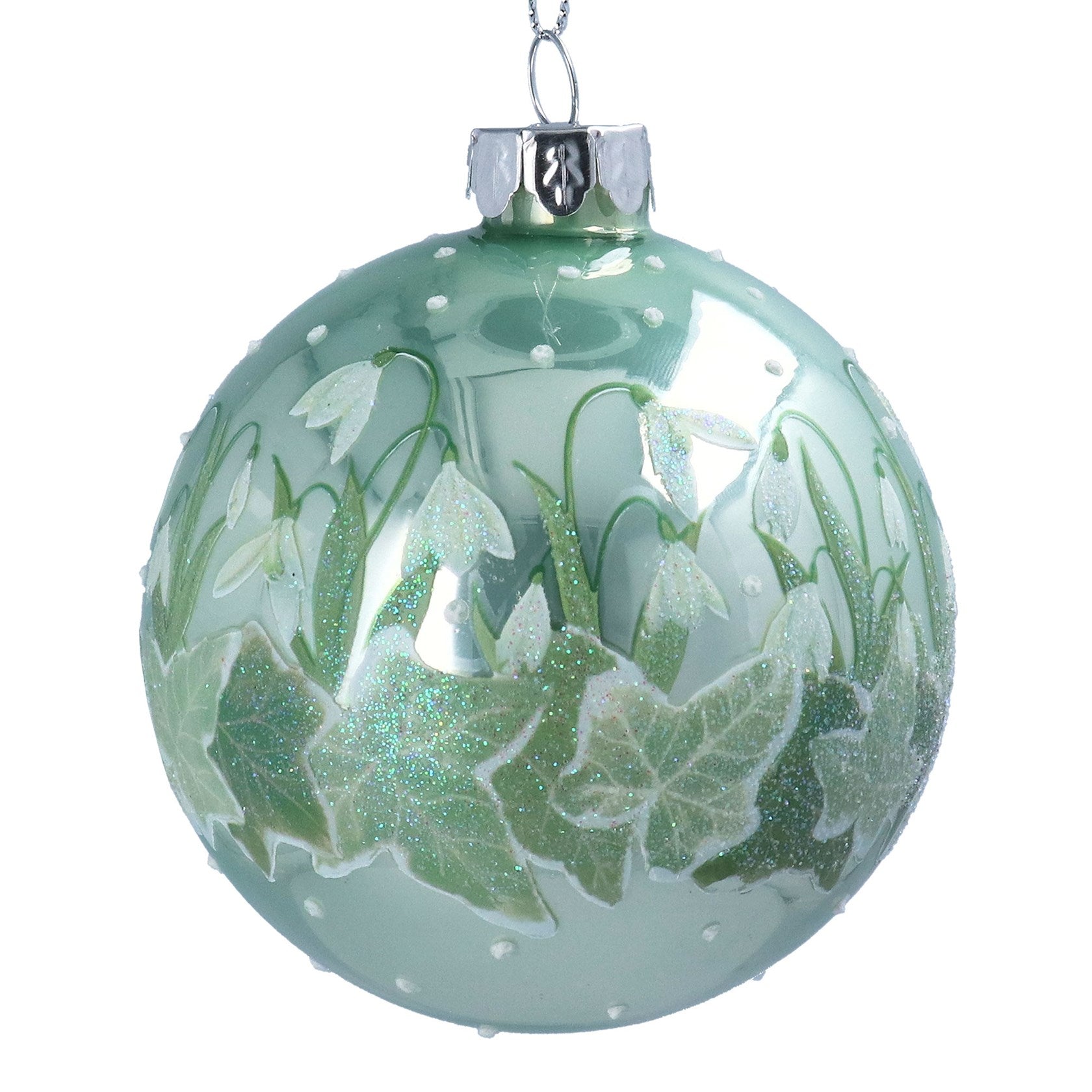 Pearl Sage Green Glass Ball with Snowdrops & Ivy, beautiful festive addition. Dimensions: 8cm x 8cm x 8cm