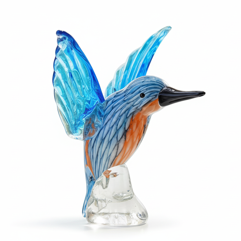 Perched gracefully, it features a glossy finish with vivid blue wings, an orange chest, and a fine black beak - every angle reveals careful craftsmanship and lifelike form.