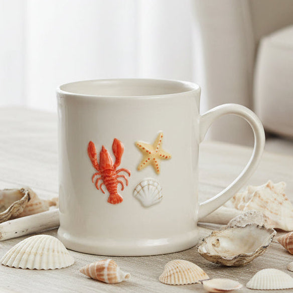 Bring a touch of the seaside to your daily brew with this charming stoneware mug, featuring a lobster, shell, and starfish design.