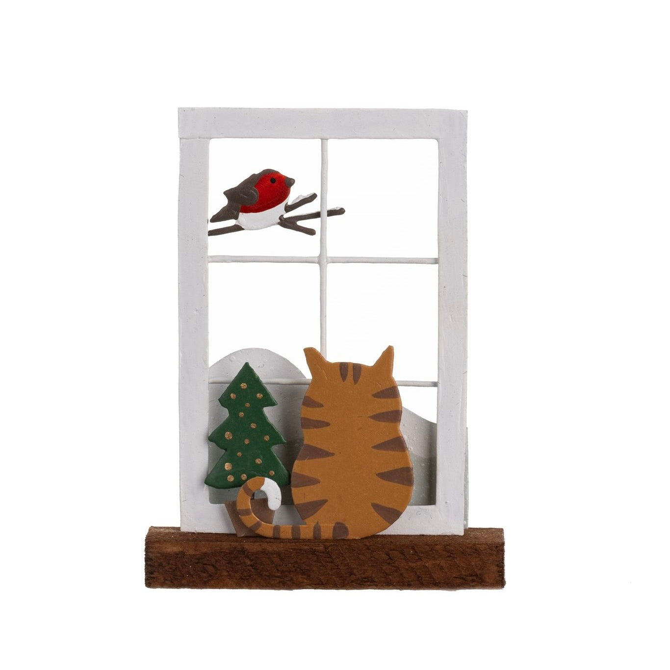 Add a sweet touch to your Christmas decor with this sweet tin ornament featuring a cat gazing out to a snowy scene, watching a robin!