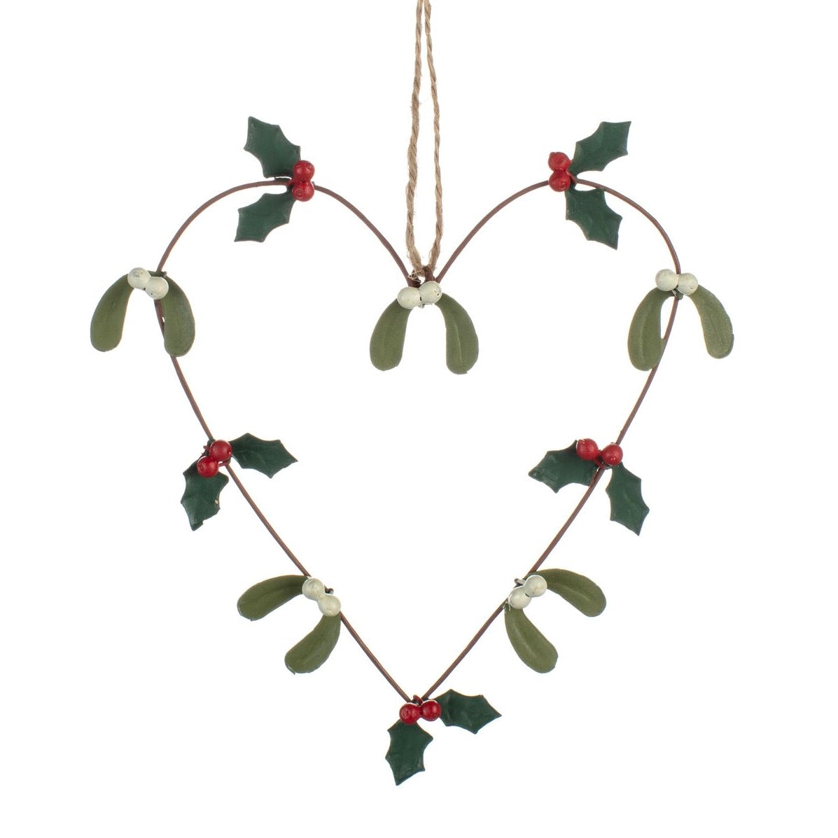 Celebrate the season with this sweet hanging decoration featuring a wire heart detailed with holly and mistletoe.