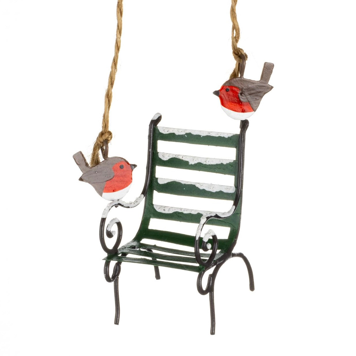 This adorable hanging decoration features two robins perched on a snowy park bench - a sweet decoration for your tree.