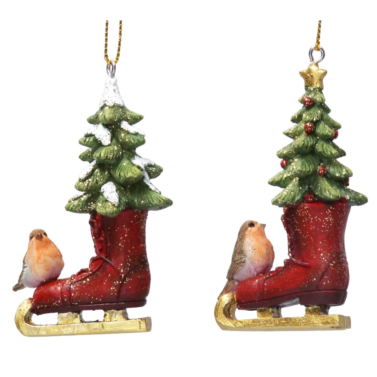 Add a whimsical touch to your Christmas tree with these charming hanging decorations featuring a robin perched on an ice skate, complete with a miniature Christmas tree nestled inside.