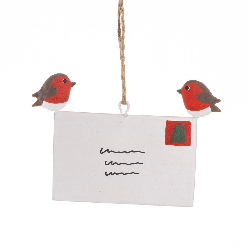 This adorable hanging tin decoration features two sweet robins carrying a Christmas card, ready to be delivered!