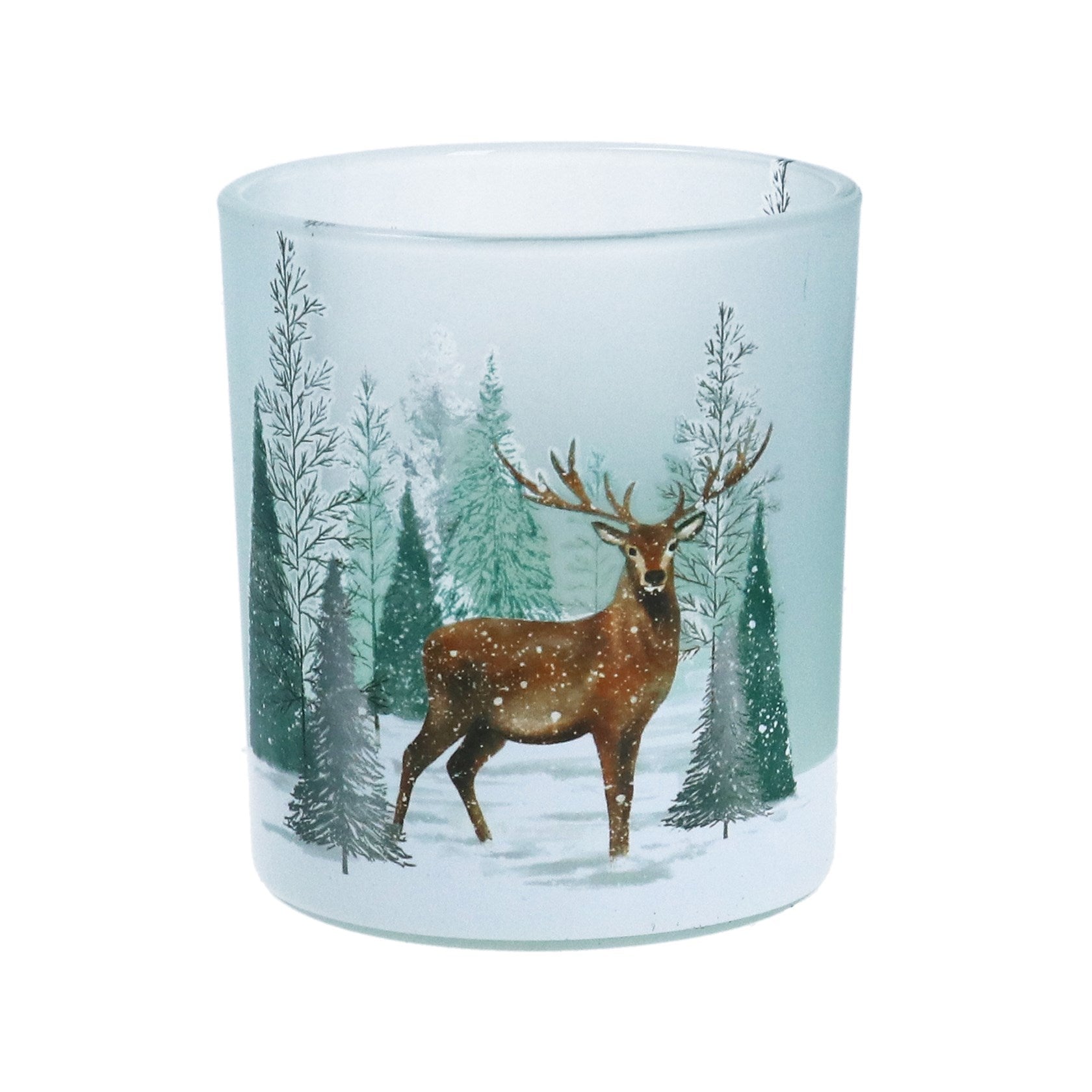 Festive Woodland Stag Snow Scene Glass Nite Lite, perfect for creating a cosy Christmas ambience. Dimensions: 8cm x 7cm x 7cm