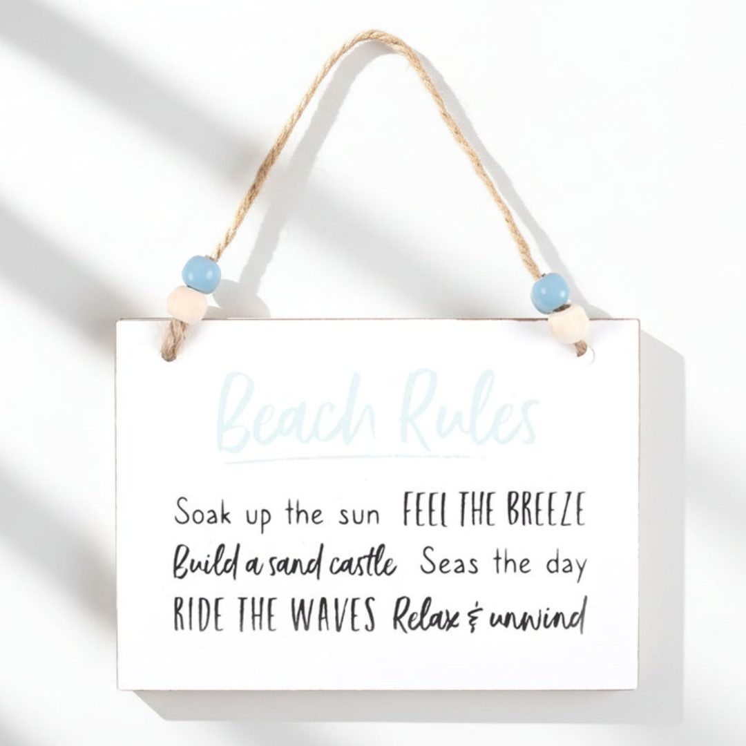 Reads "Beach Rules: Soak up the sun, Feel the breeze, Build a sand castle, Seas the day, Ride the waves, Relax & Unwind"