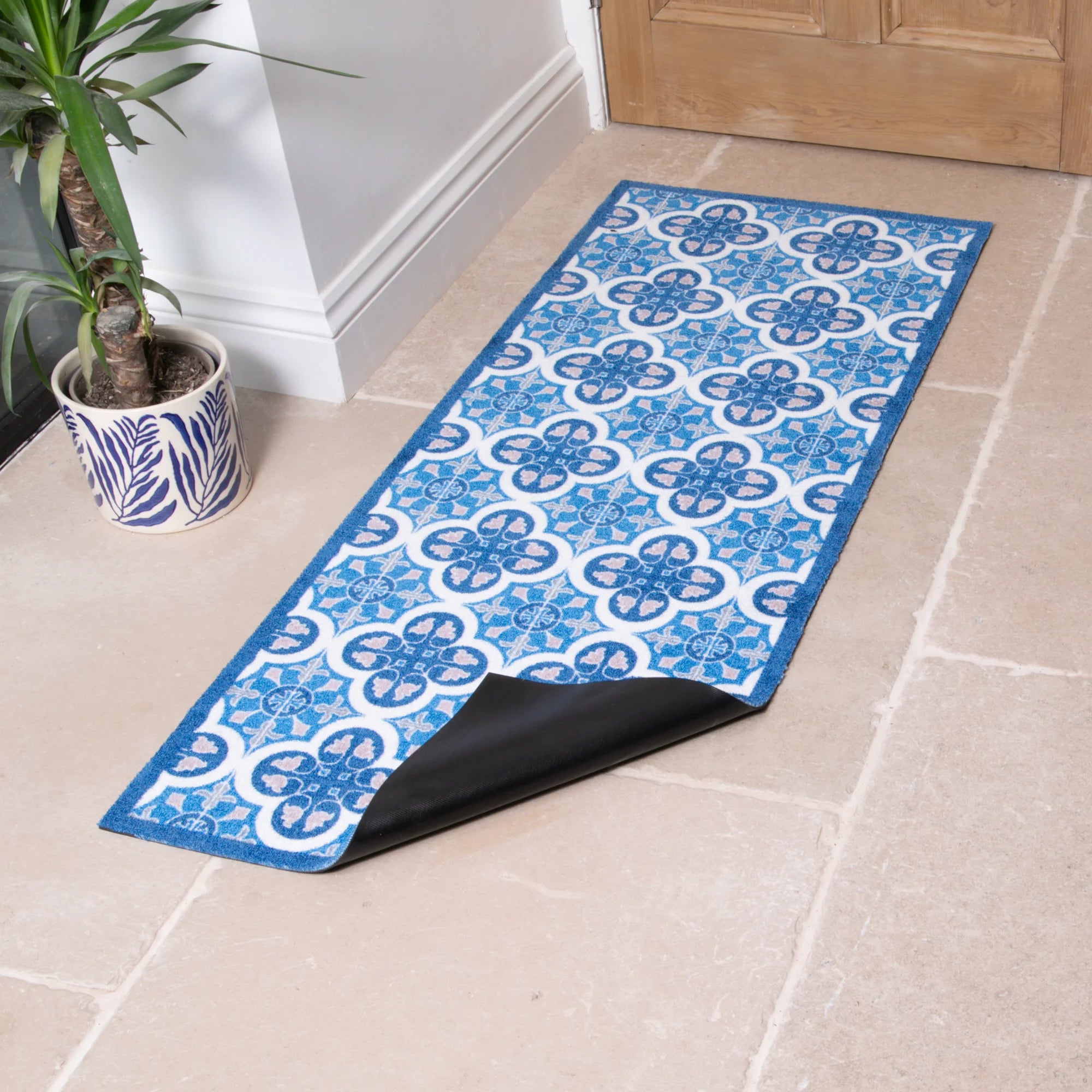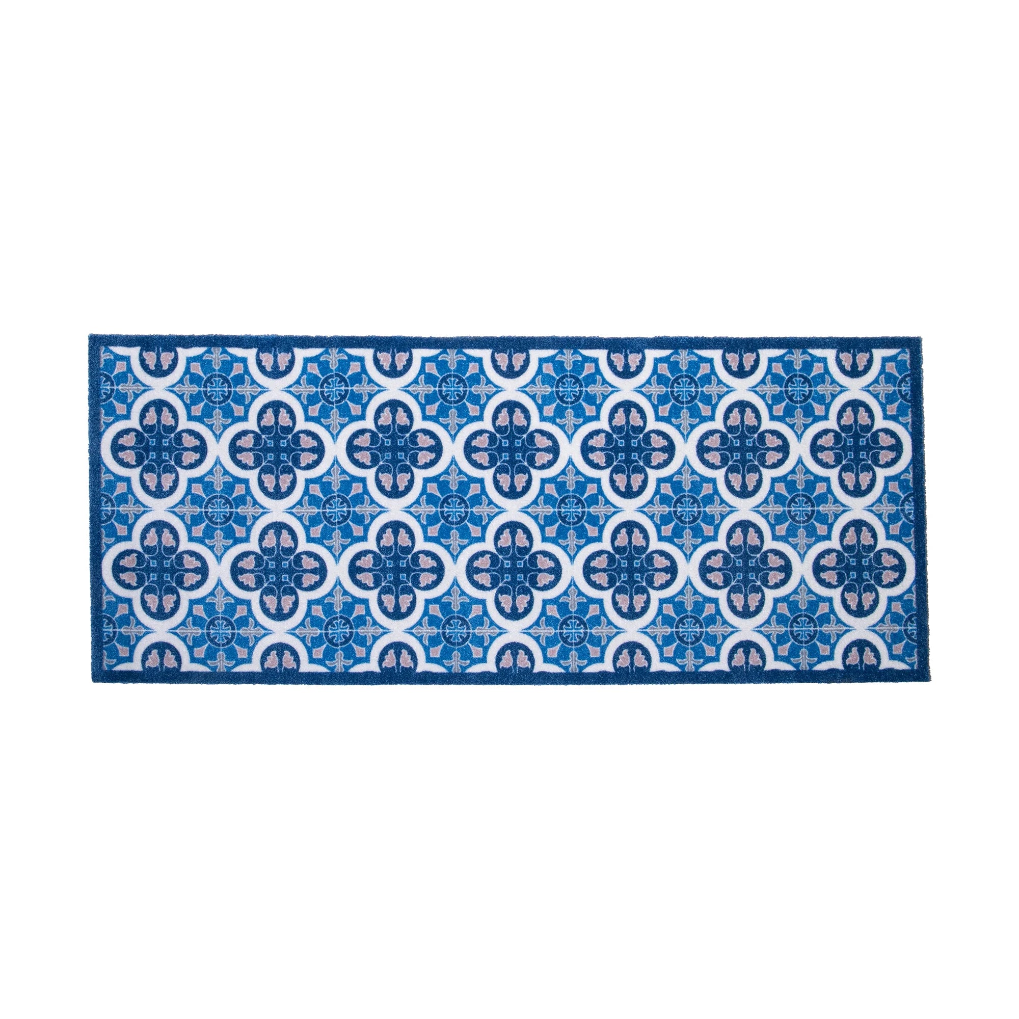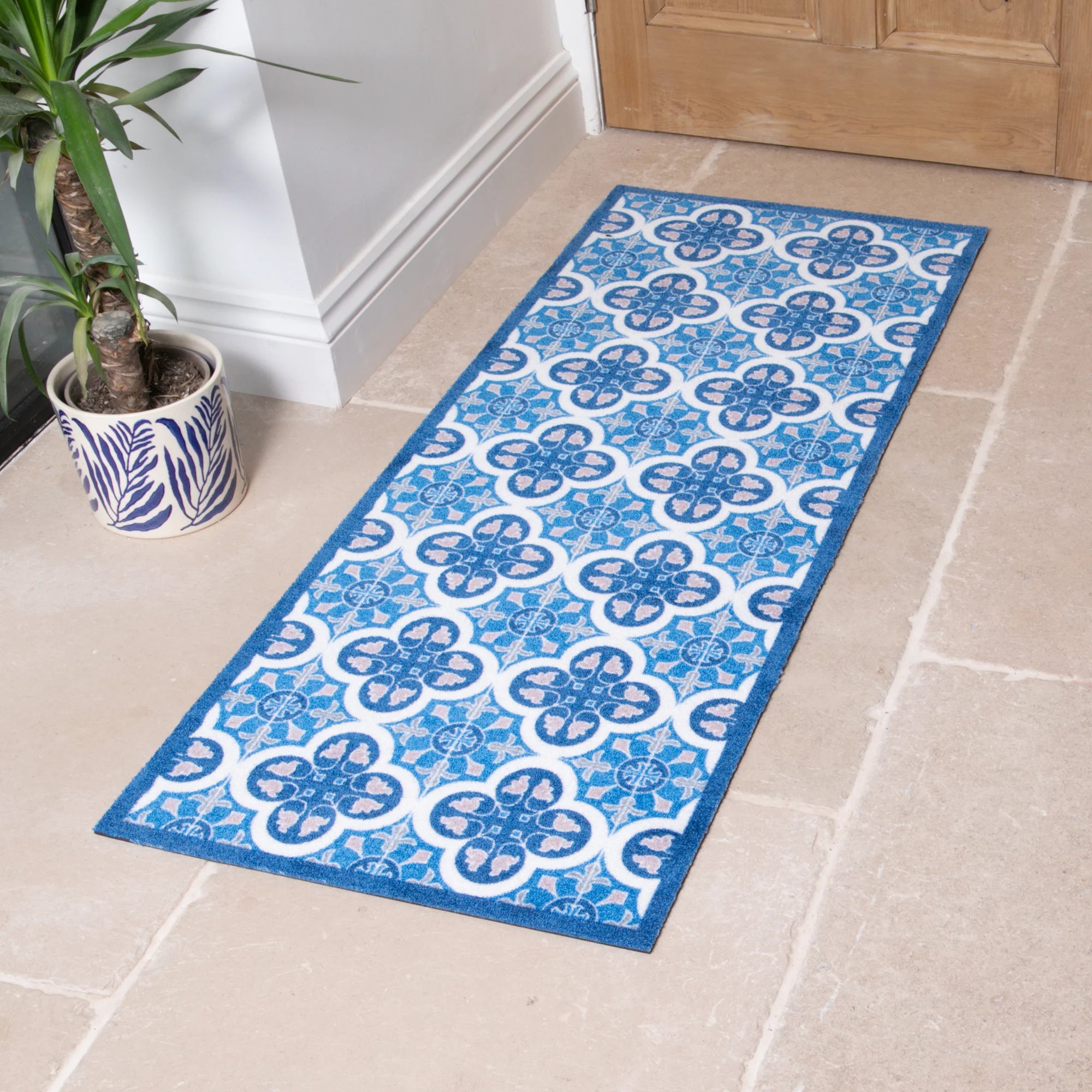 Upgrade your hallway and long spaces this indoor washable runner, featuring a stunning blue mosaic tile pattern.