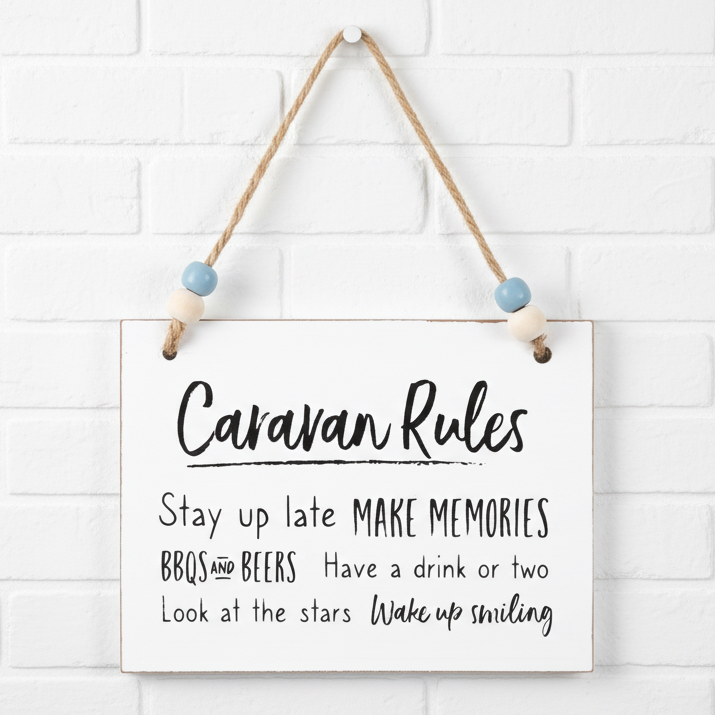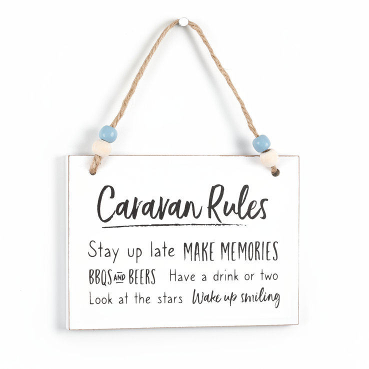 The perfect token gift for family and friends, this white wooden hanging sign features the fun text: “Caravan Rules: Stay up late, Make memories, BBQs and beers, Have a drink or two, Look at the stars, Wake up smiling.”