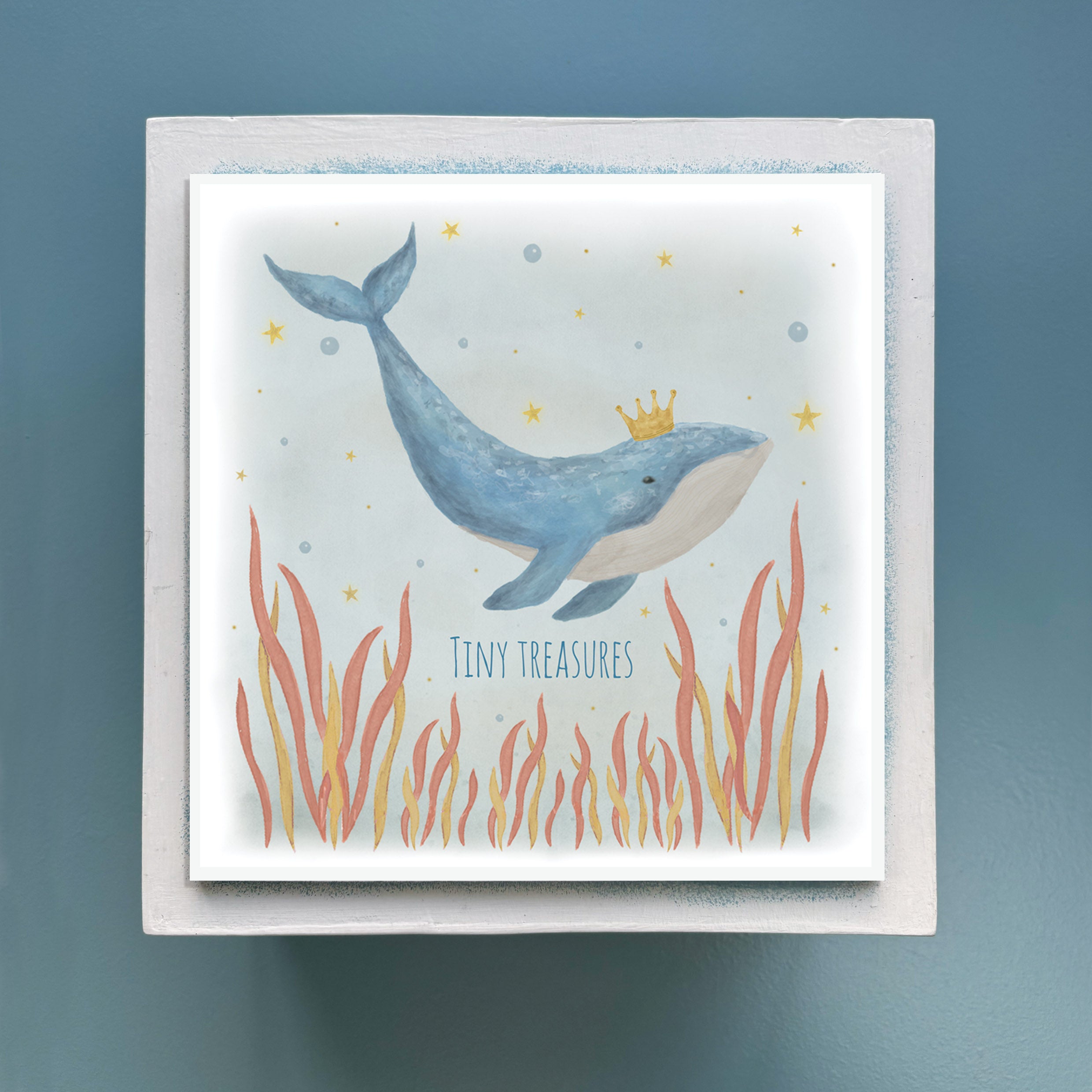 This charming wooden keepsake box features a playful blue sea theme, with a little crowned whale on the front and the words “Tiny Treasures”.