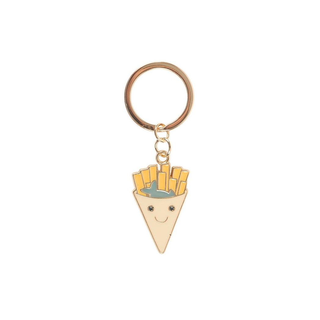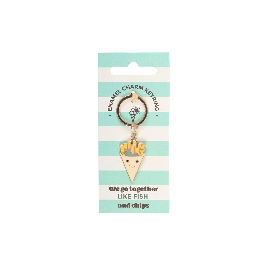 Celebrate classic seaside nostalgia with this enamel keyring, featuring a cheerful green fish and chips design.