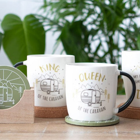 Each mug features a charming caravan illustration with the titles “King of the Caravan” and “Queen of the Caravan.”