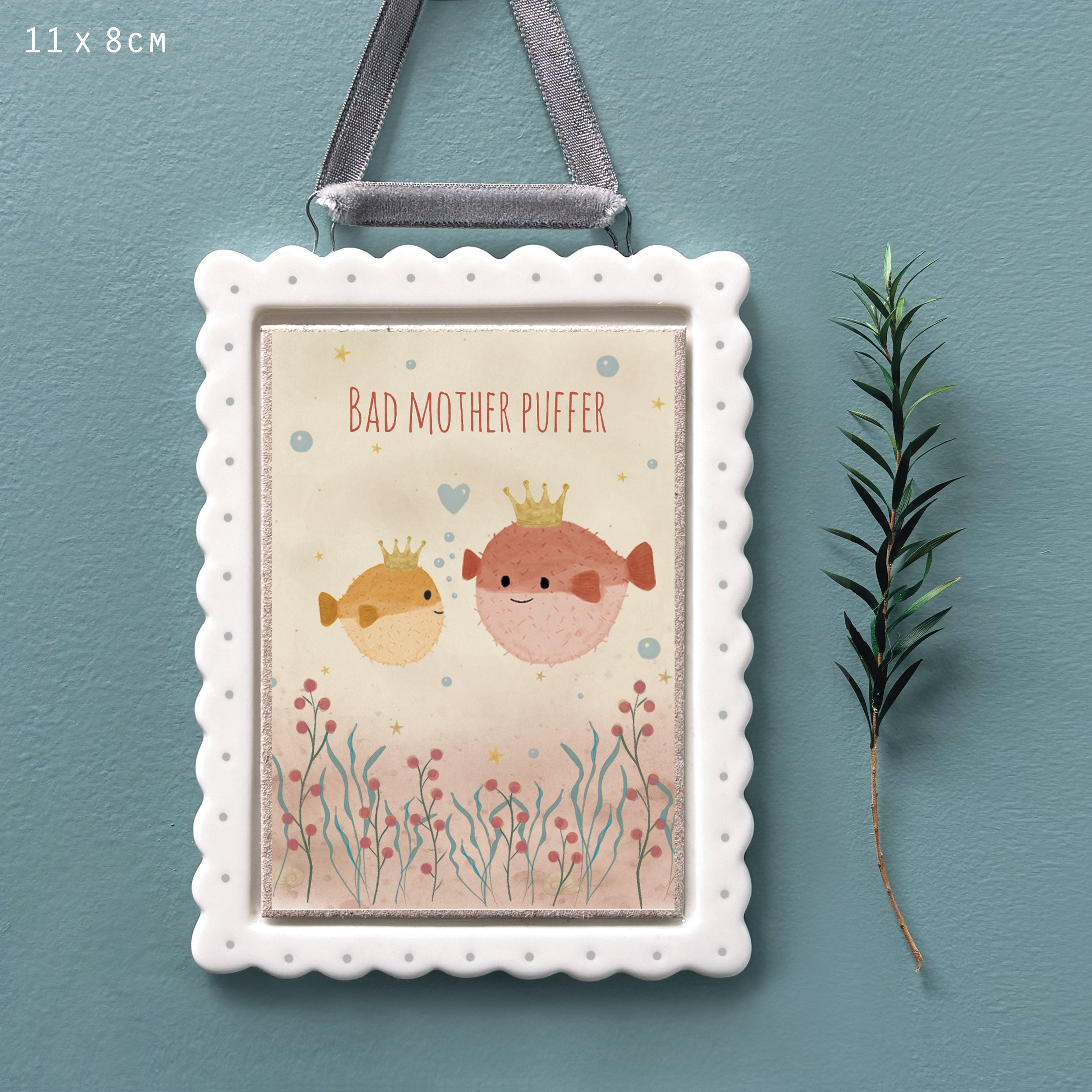 This whimsical scalloped porcelain frame features two crowned pufferfish and the cheeky message, “Bad Mother Puffer.”
