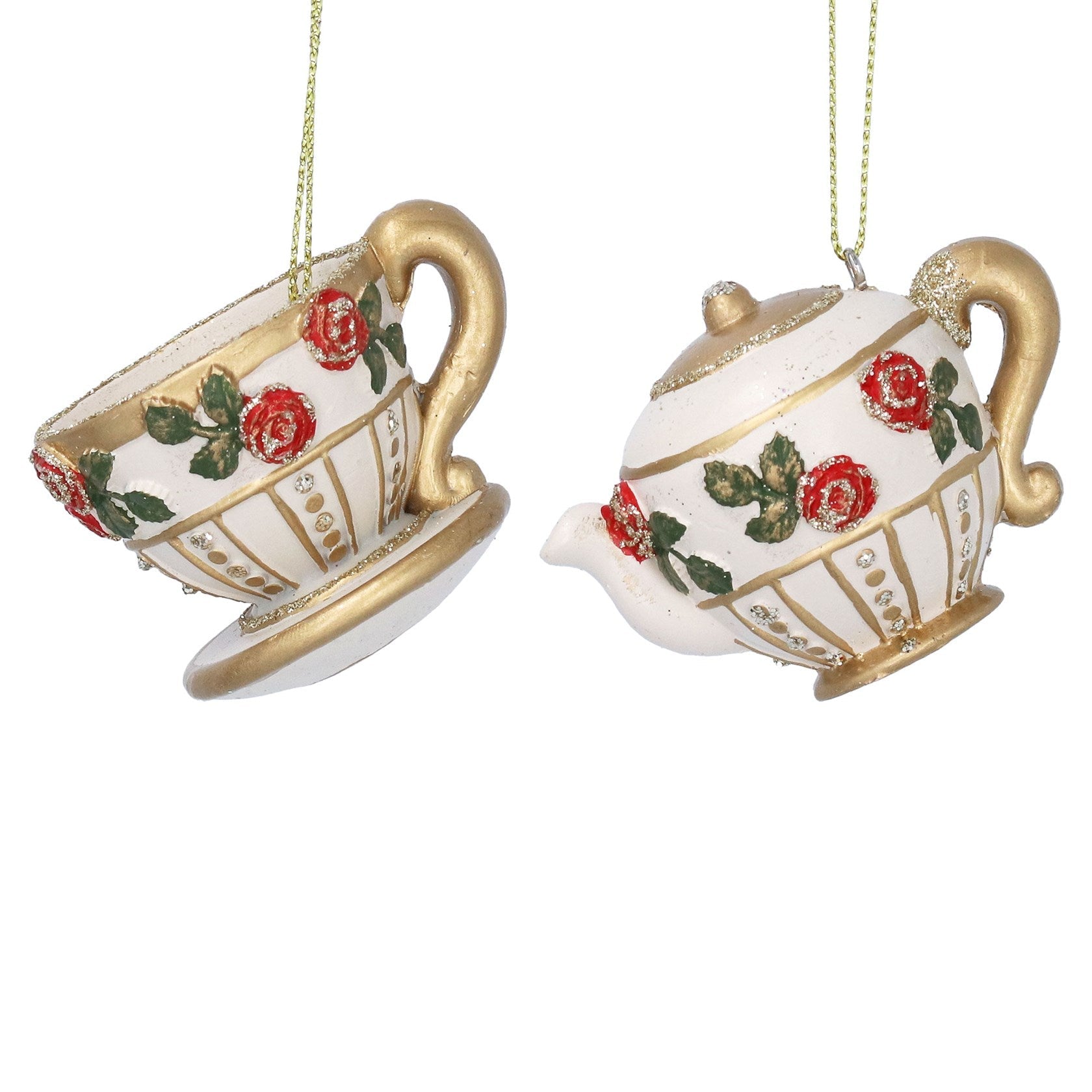 This dainty teacup and teapot decoration, adorned with charming red roses, adds a whimsical and elegant touch to your Christmas tree.